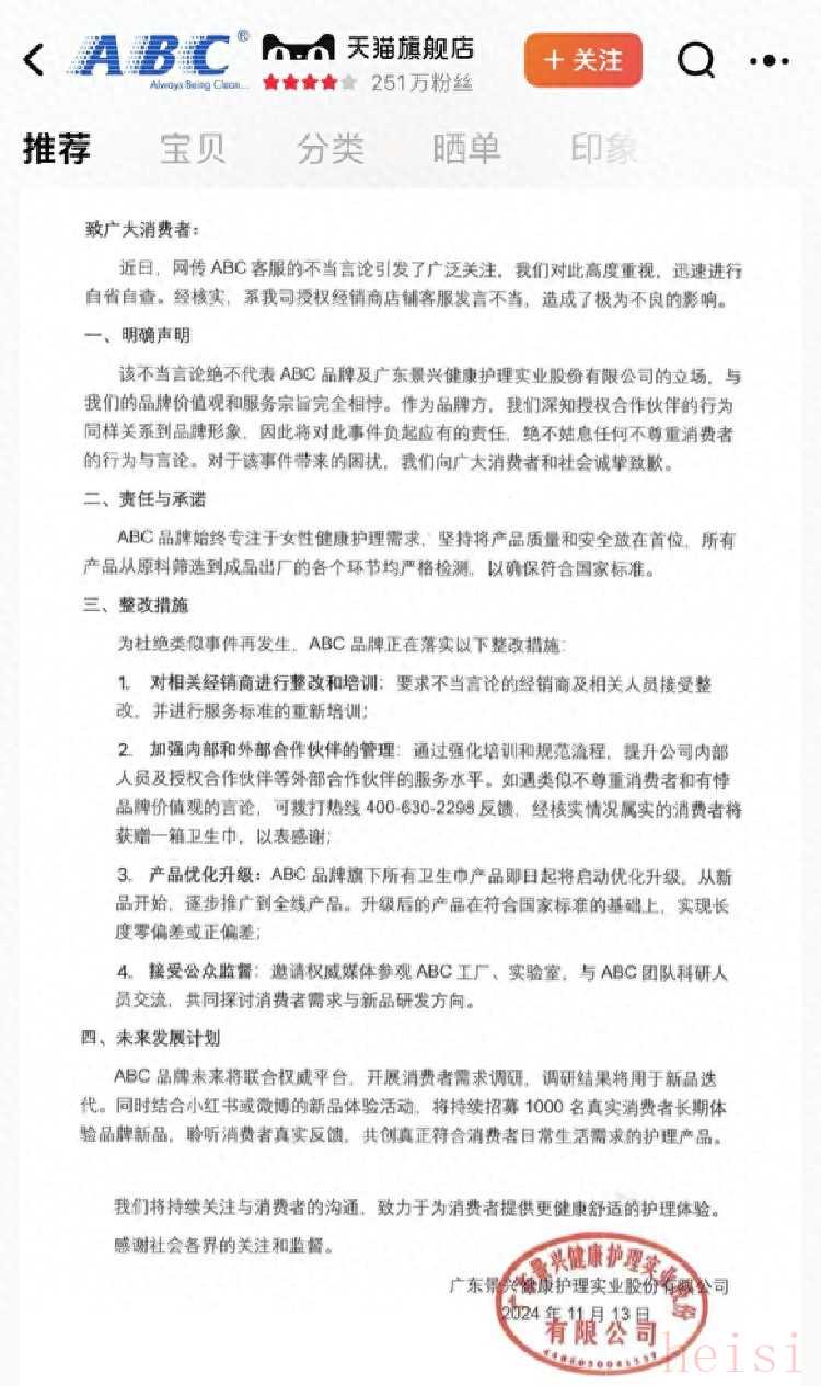 此言论引发热议,被指“态度傲慢”,不尊重消费者。11月13日,ABC官微发布声明,就近日网传客服的不当回复致歉。