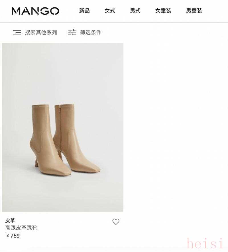 其中,一批次MANGO牌短靴AIRE被检出帮底剥离强度、勾心两项指标不合格,易造成鞋子开口开胶、变形等问题。记者查询其官网发现,该型号短靴仍然在售,售价759元。