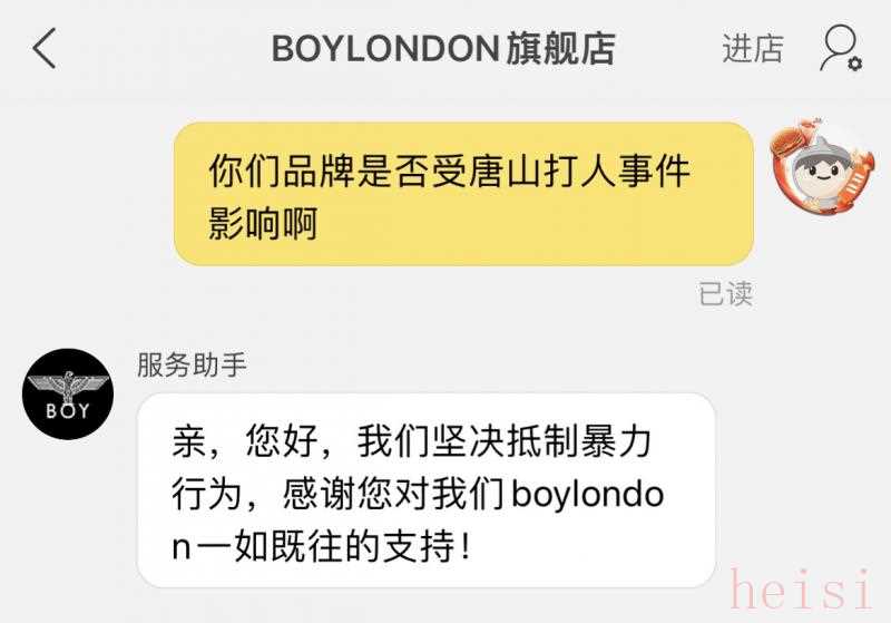 6月16日,北京青年报记者向BOY LONDON天猫官方旗舰店客服人员咨询品牌是否受唐山打人事件影响等相关问题,客服均统一回复:“亲,您好,我们坚决抵制暴力行为,感谢您对我们一如既往的支持!”