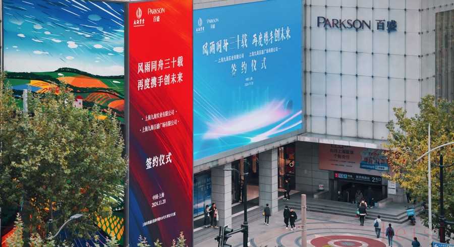 百盛百货(PARKSON)是由马来西亚金狮集团于1987年创立的百货连锁商场。1994年,金狮百盛在北京复兴门内大街落地,成为首家进入中国的东南亚百货品牌。同年,他们与上海九海实业有限公司签署战略合作协议,入驻位于淮海中路陕西南路路口久事复兴大厦的商业裙房。两年后,百盛商场在淮海中路开业,凭借其优越的地理位置和丰富的商品种类,成为上海消费者心目中的时尚地标。