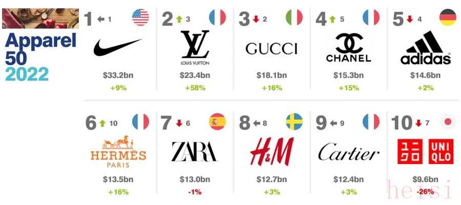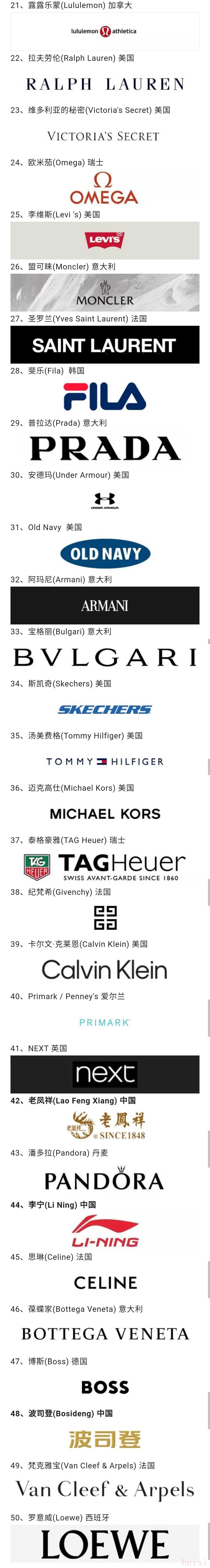 50大品牌总价值3079亿美元。其中有9个法国品牌价值832亿美元,占比27.0%。13个美国品牌价值798亿美元,占比25.9%。7个意大利品牌价值381亿美元,占比12.4%。3个德国品牌价值208亿美元,占比6.8%。5个中国品牌价值153亿美元,占比5.0%。3个瑞士品牌价值148亿美元,占比4.8%。美国、法国依然是占据着世界服装品牌的半壁江山。而中国品牌也呈现了不断崛起的状态,随着这次冬奥会的结束,中国品牌又一次向世界展示了实力。