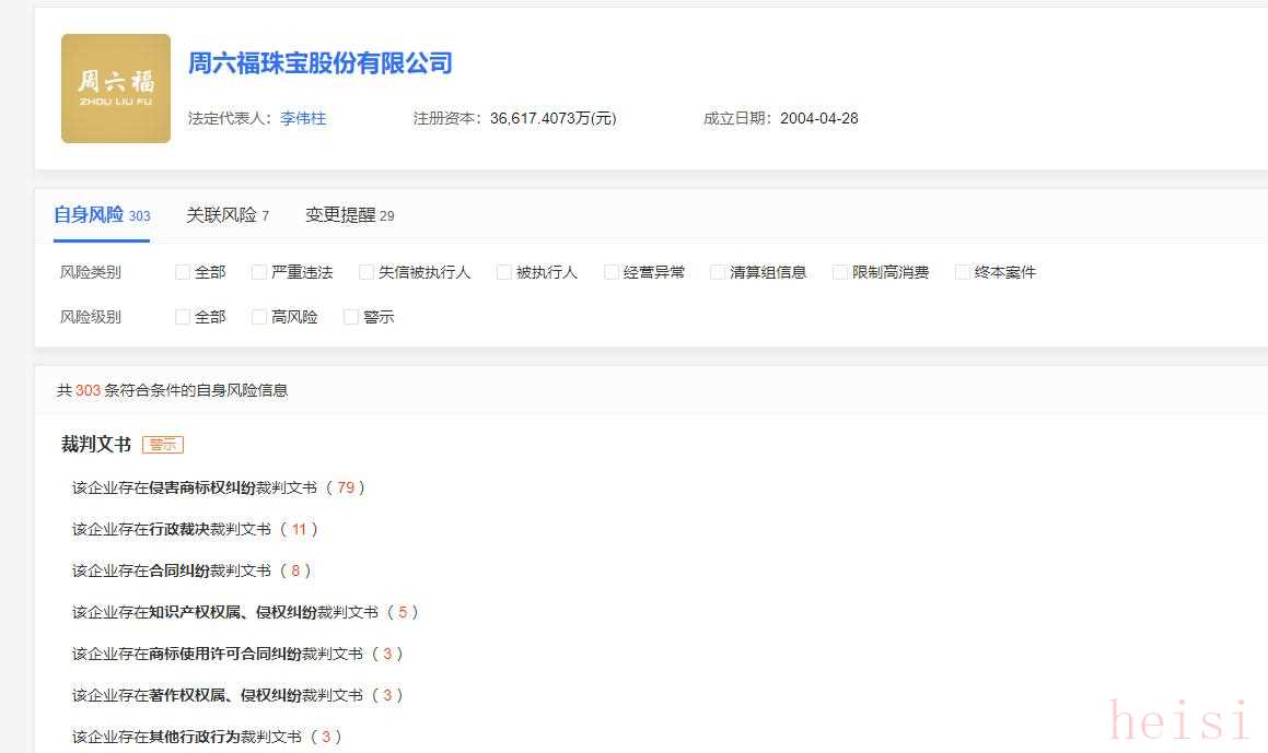 对于名字涉嫌“抄袭”的事情,曾经还发生过一件有趣的事情,2016年周六福在香港开了第一家门店,开业当天请来了刘嘉玲当嘉宾。结果刘嘉玲在采访中表示:“刚开始也以为是周大福或者六福珠宝,后来才知道原来是周六福”。在企查查和天眼查的官网上,我们也可以发现因为注册商标的问题,这些“伪”周氏企业涉及众多的商标侵权案件。