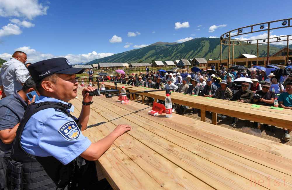 2024年7月22日,在新疆阿勒泰地区布尔津县禾木哈纳斯蒙古族乡哈纳斯村,喀纳斯边境派出所民警在村民大会上给村民宣讲边境法律法规。近年来,喀纳斯边境派出所通过“警村企党支部联合工作站”模式,联合当地群众、景区一起解决游客难题,大大提升了警务效率,逐步形成了“景中警 贴心人”的旅游警务品牌。