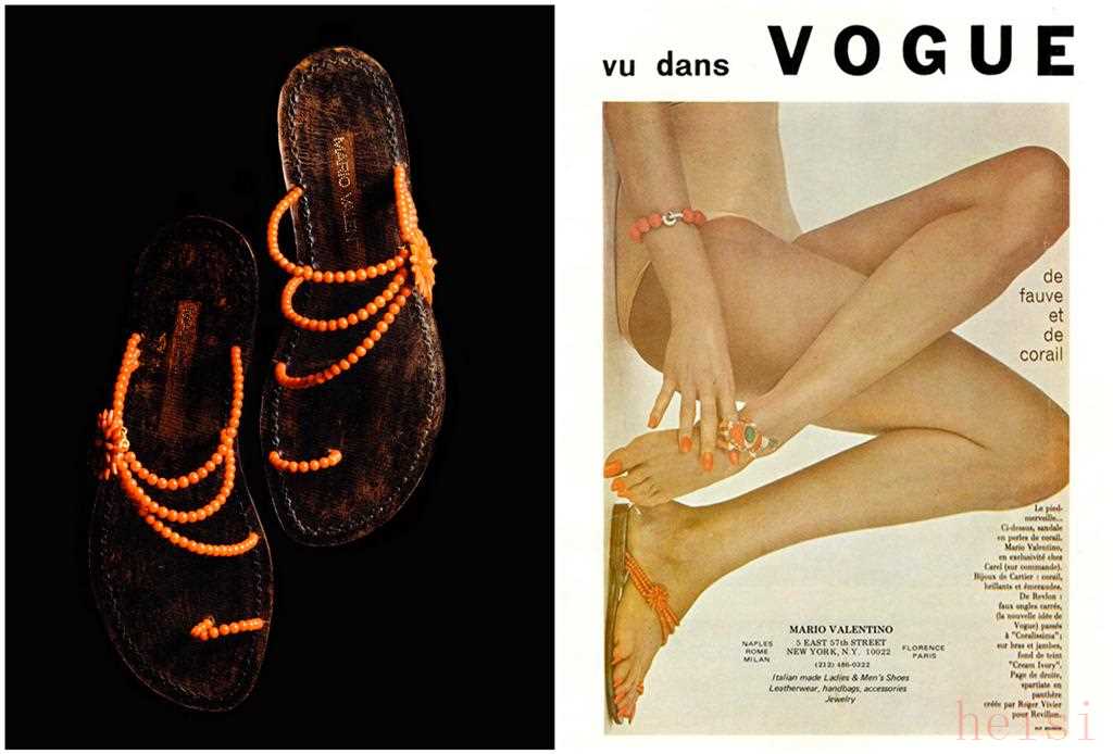 1954年,马里奥设计的珊瑚凉鞋被《Vogue》法国版报道,引起市场关注,马里奥借机和美国I.Miller鞋业建立了合作关系,珊瑚凉鞋后来被瑞士Bally鞋履博物馆收藏,成为20世纪经典设计。
