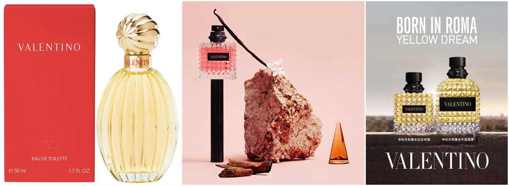 从左至右:华伦天奴第一款香水、美妆香水、生于罗马香水