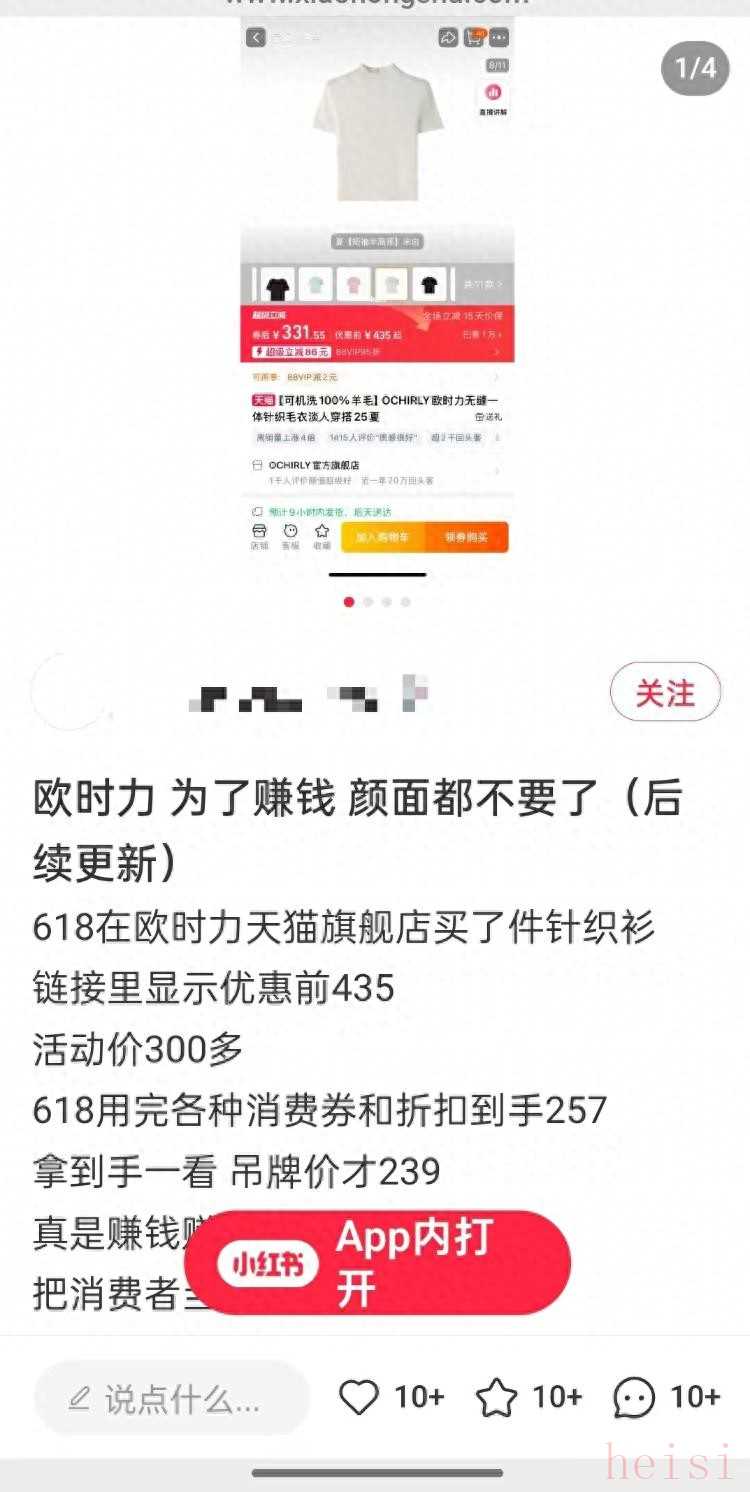 近日,有网友发帖称,618大促期间,自己在服装品牌欧时力天猫旗舰店购买了一件针织衫,发现活动折扣价高于吊牌价。6月26日,海报新闻记者咨询到欧时力所属公司客服,其表示,为吊牌印刷错误。