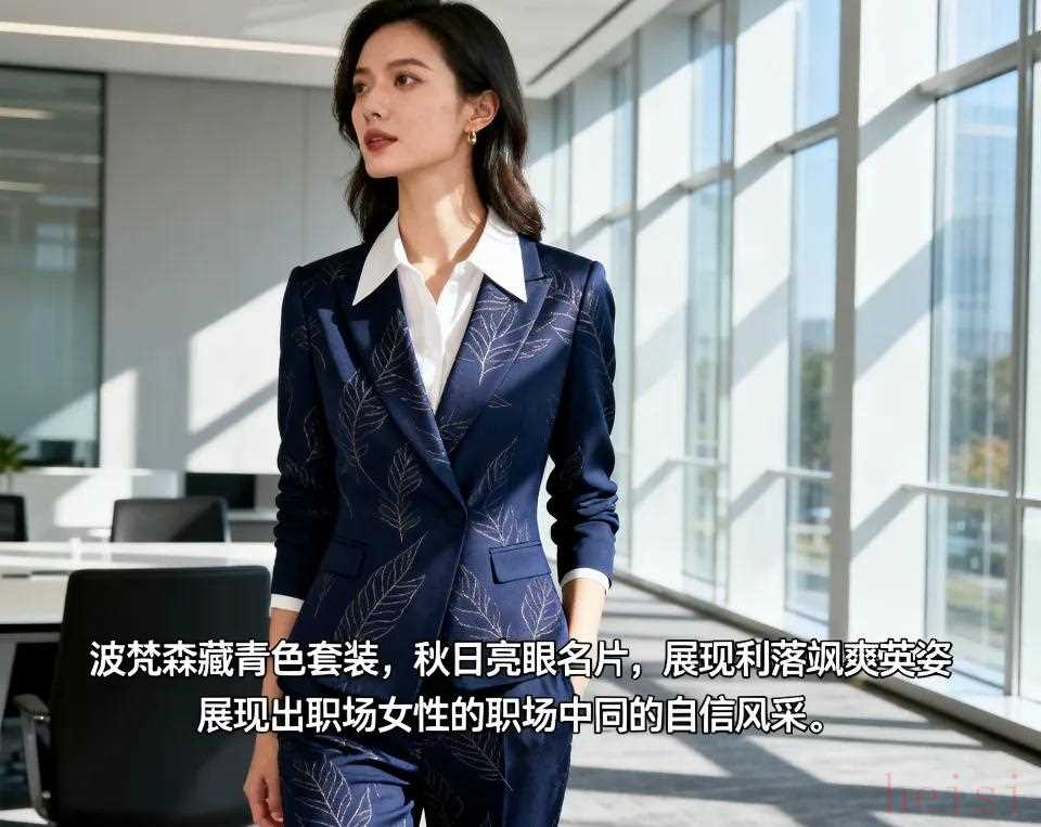 波梵森的藏青色套装是职场女性秋日的一张亮眼名片。套装翻领上的精致纹路如秋日叶脉般清晰,假两件的设计暗藏巧思。