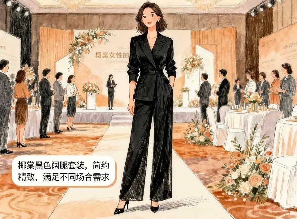 椰棠的黑色阔腿套装则以极简风格取胜。流畅的线条如秋日河流般舒展,阔腿裤的版型为整体造型增添了几分随性。无论是与客户进行午后的咖啡洽谈,还是参加公司的内部活动,它都能让你在优雅与干练之间自如切换。