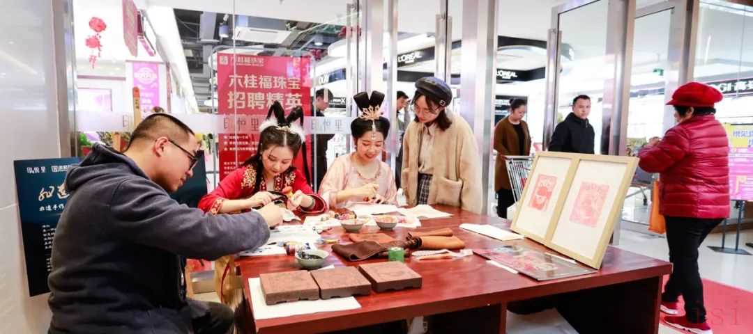 如果今天你去印悦里逛逛,就可以和汉服小姐姐们一起品味千年运河文化;可以与非遗传承人一起体验墨拓技法——试着把器物原貌转移到平面拓纸上;还有海量的开业优惠像运河水一样席卷而来;而买东西的时候,全程全息都会置身在运河四季的造景里……