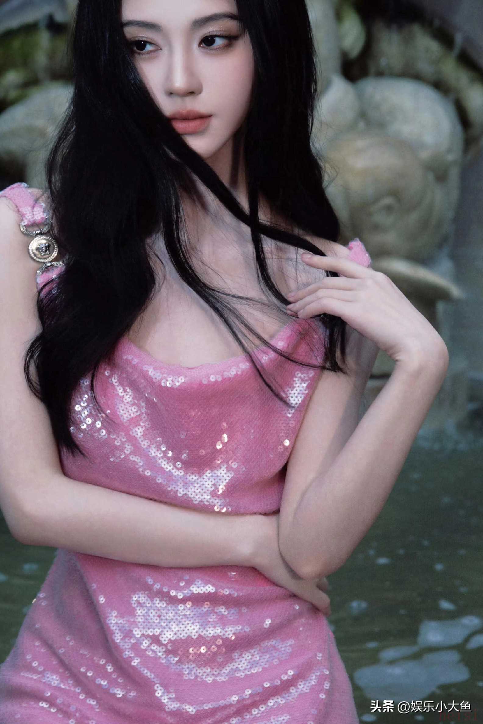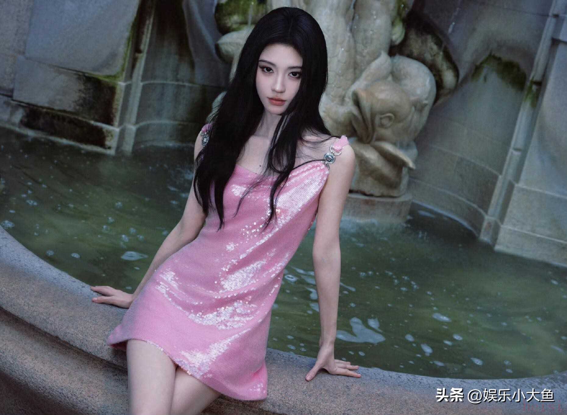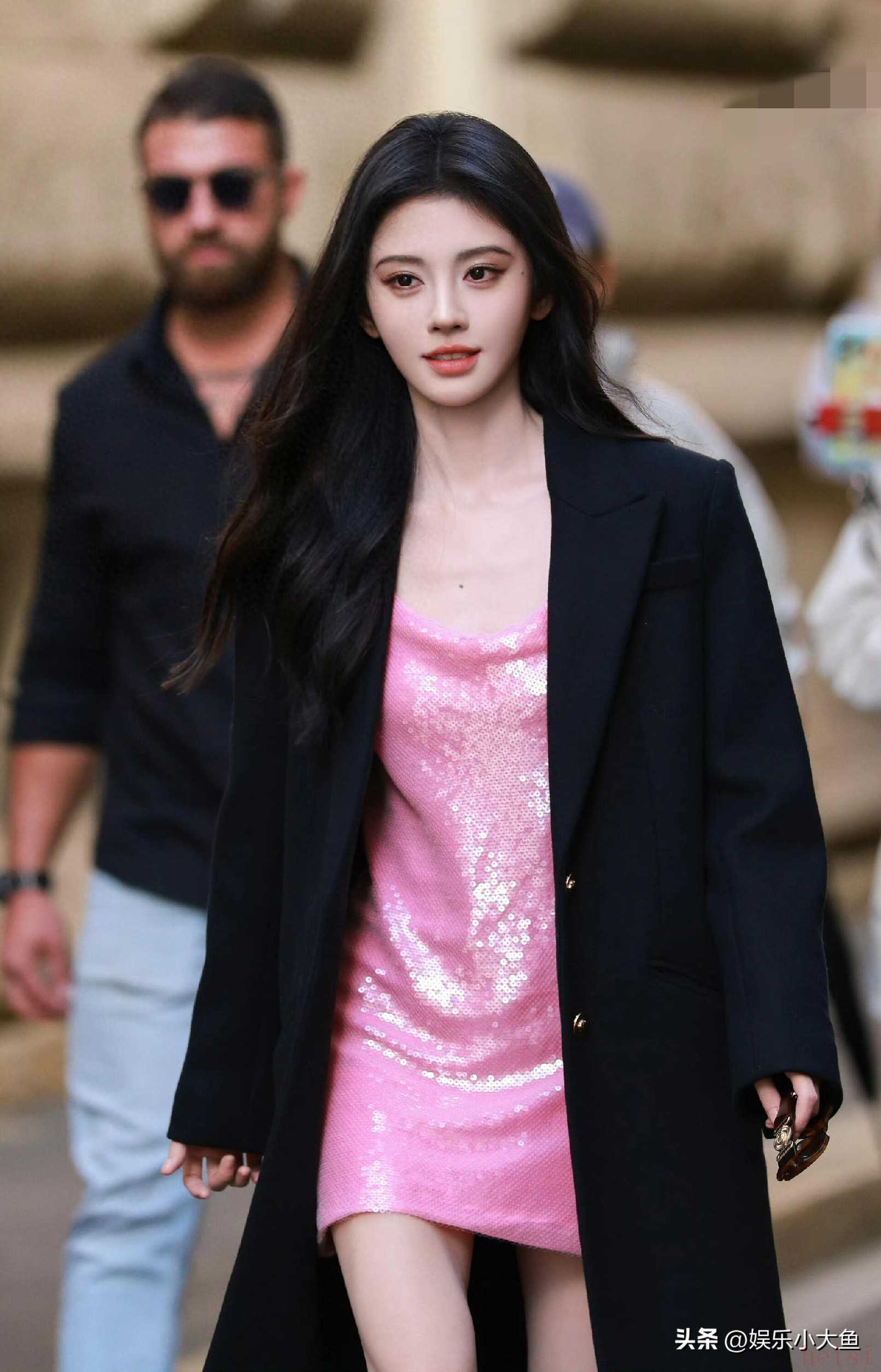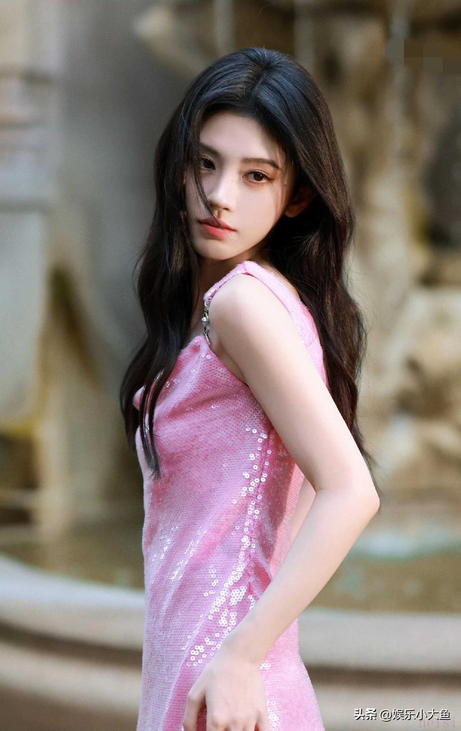 "标题:鞠婧祎亮相米兰时装周,粉色亮片真丝吊带裙闪耀全场,性感又迷人"
