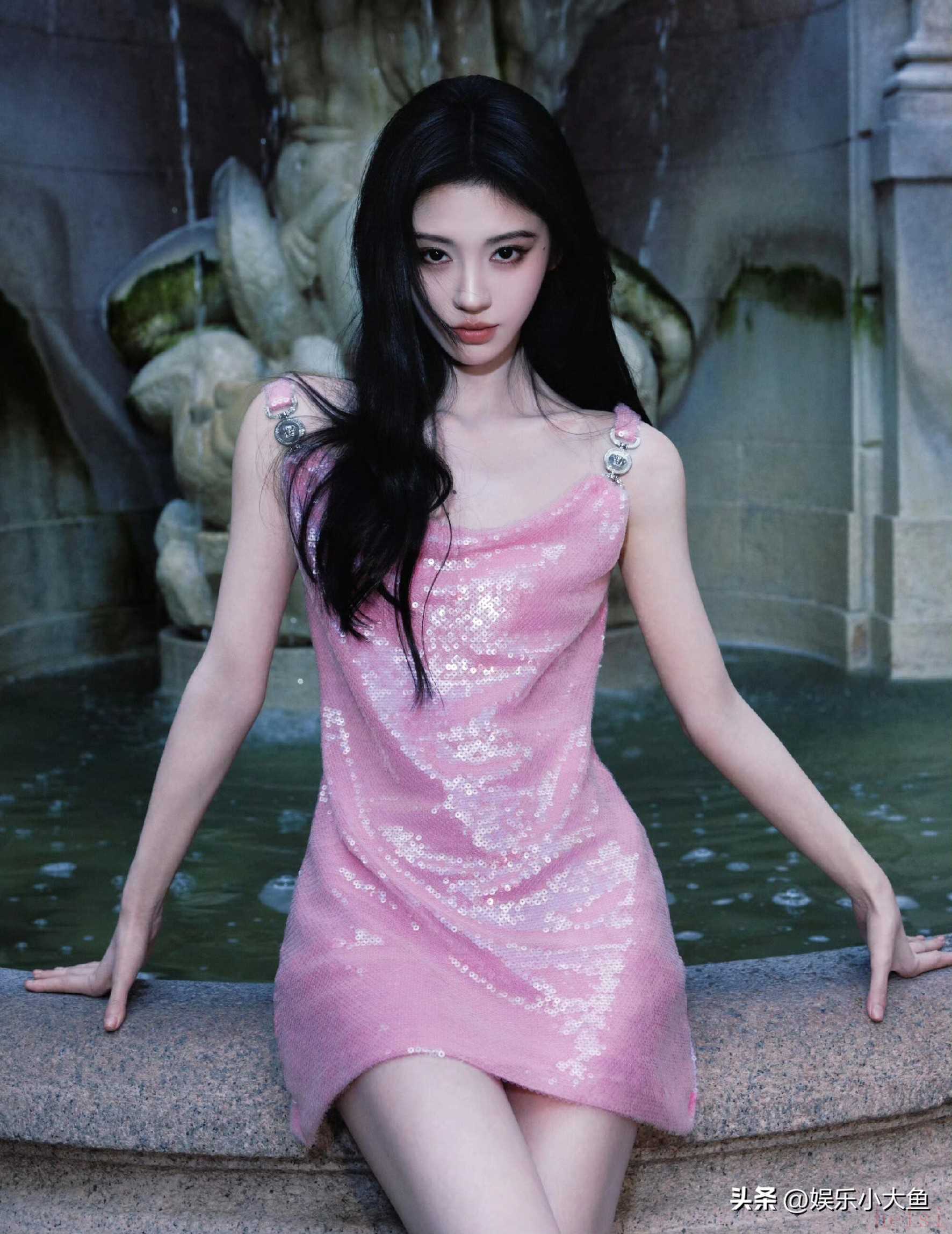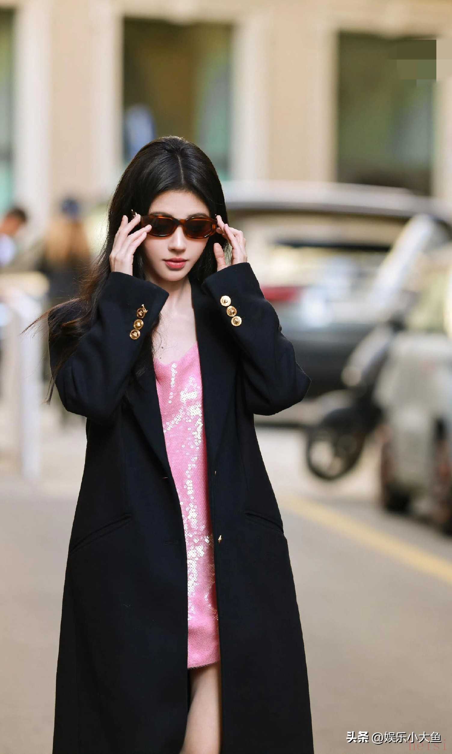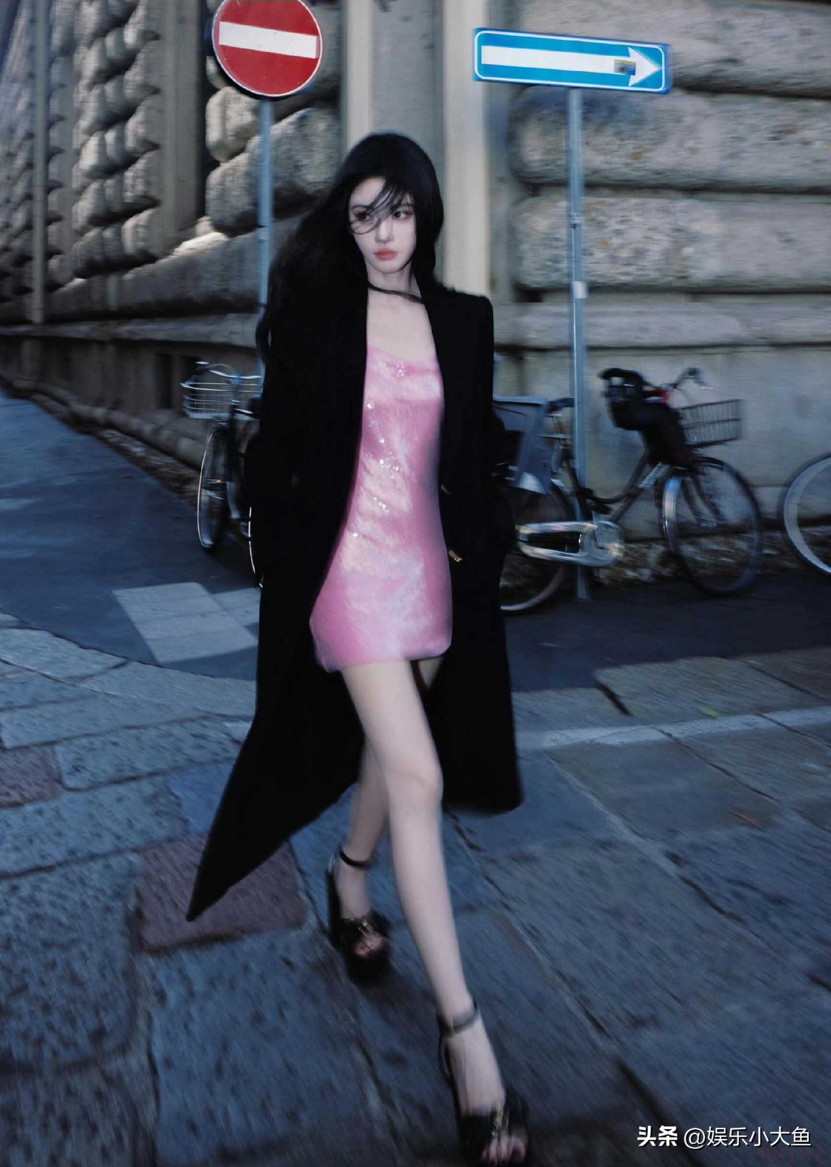 "标题:鞠婧祎亮相米兰时装周,粉色亮片真丝吊带裙闪耀全场,性感又迷人"