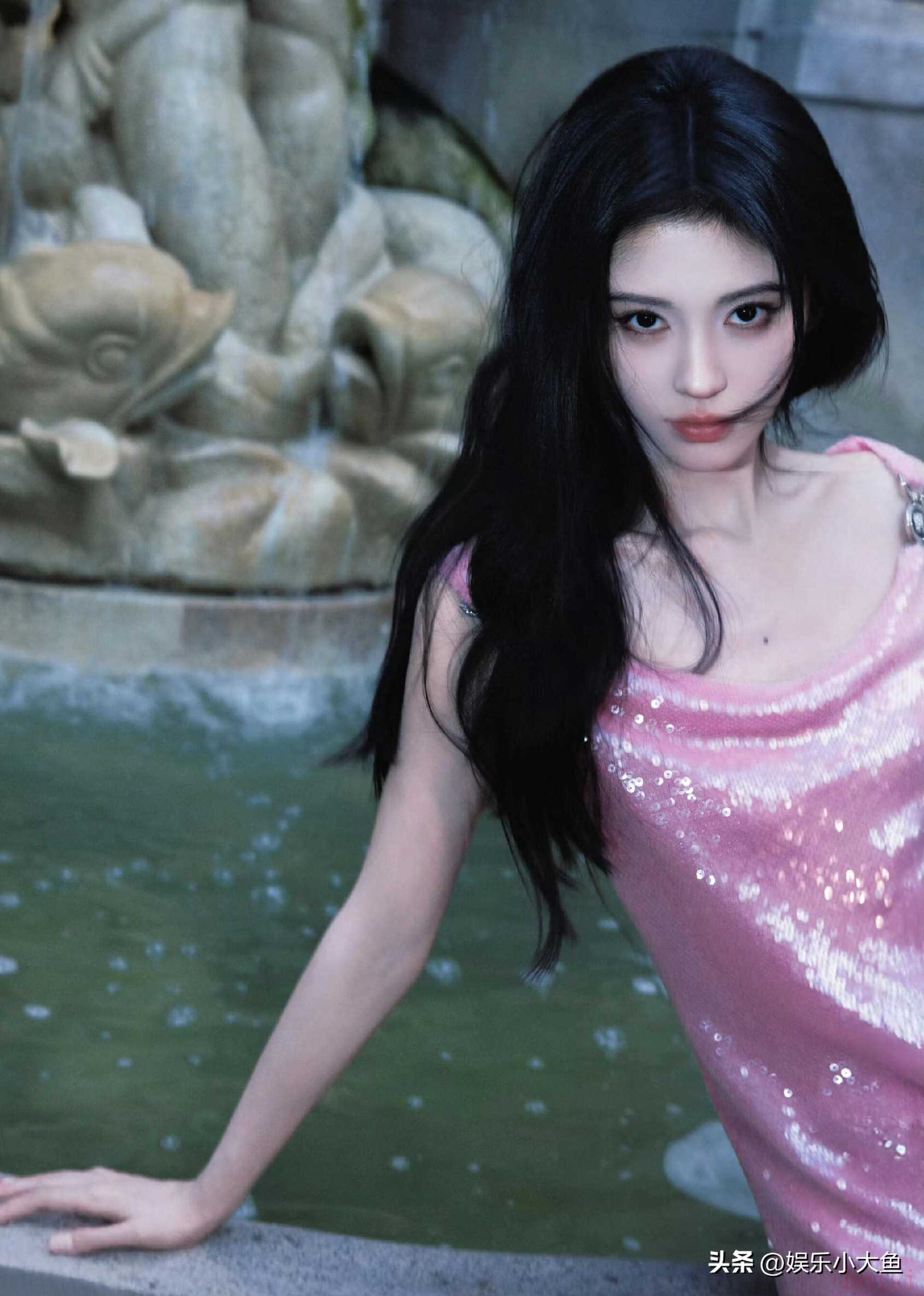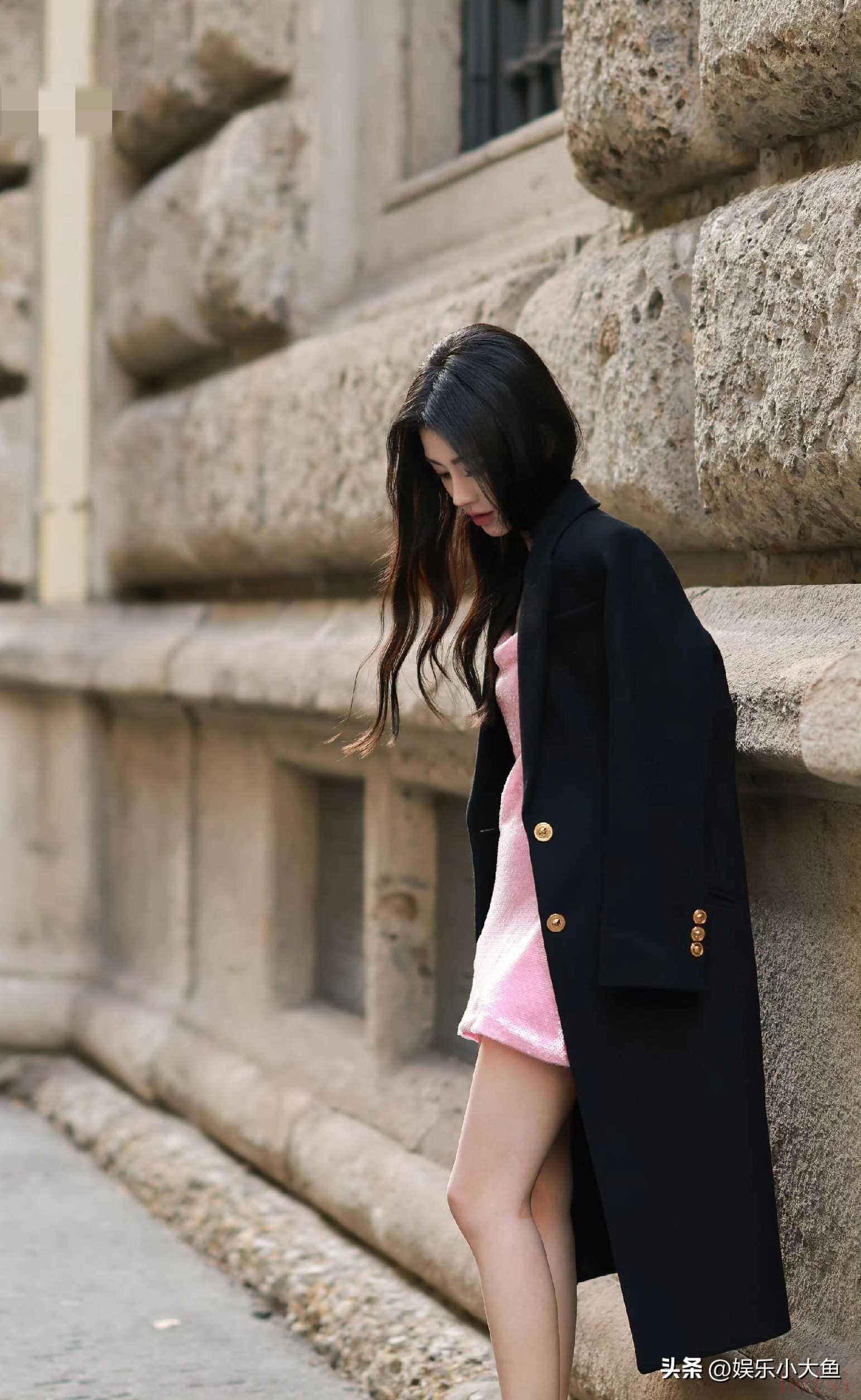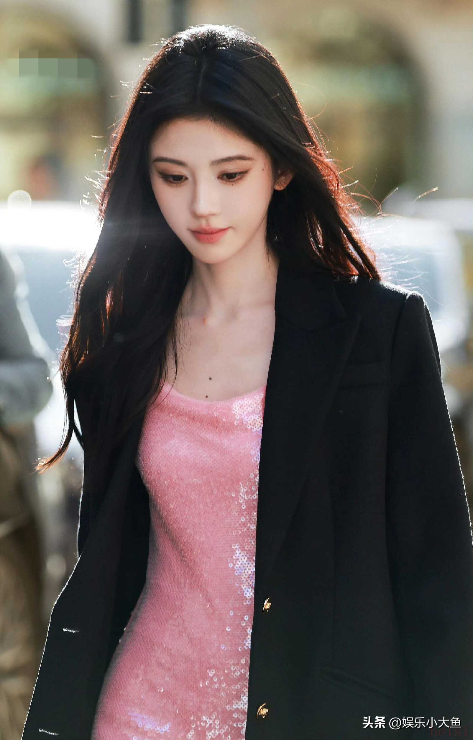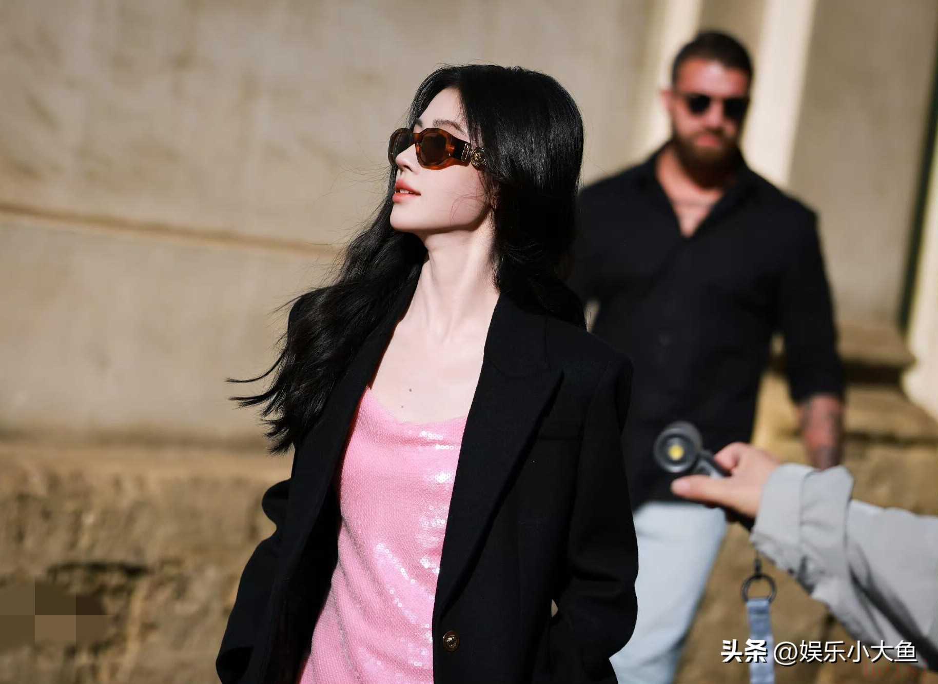"标题:鞠婧祎亮相米兰时装周,粉色亮片真丝吊带裙闪耀全场,性感又迷人"