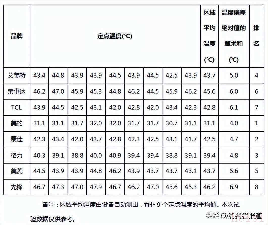 辐射均匀性主要是评价小太阳取暖器向一定距离辐射热的均匀程度。试验以样品最大高温档位对110cm处的平整涂黑胶木板进行照射,测量和计算被照射中心区域的定点温度与区域平均温度的差值,再以该差值绝对值的算术和进行排序,算术和越小,辐射均匀性越好。具体数据如下: