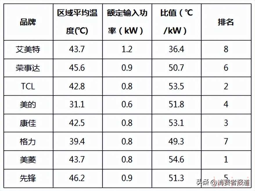 消费者感受到的取暖效果由热辐射的直线距离和取暖器的发热功率这两项因素决定。距离越远,取暖效果越差;发热功率越大,取暖效果越好。试验以样品最大高温档位对110cm处的平整涂黑胶木板进行照射,测量和计算被照射中心区域的区域平均温度与取暖器额定输入功率的比值,根据该比值进行排序,比值越大,辐射热距离越好。具体测试结果如下: