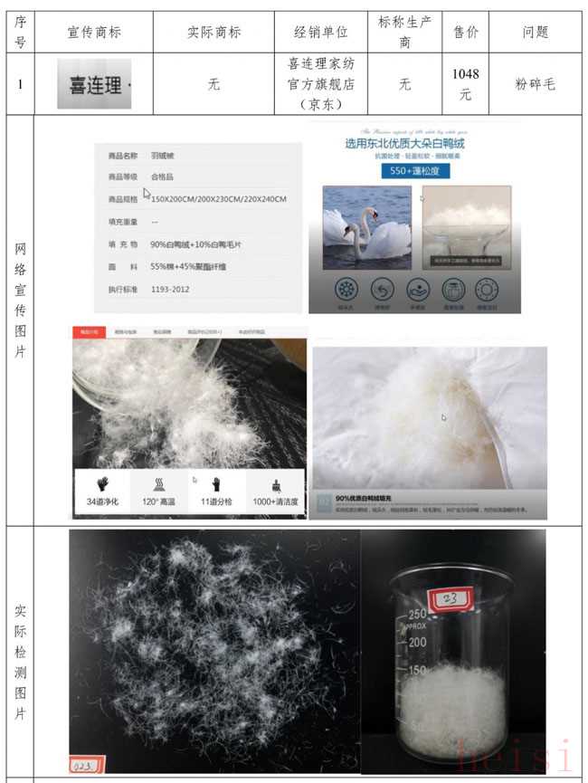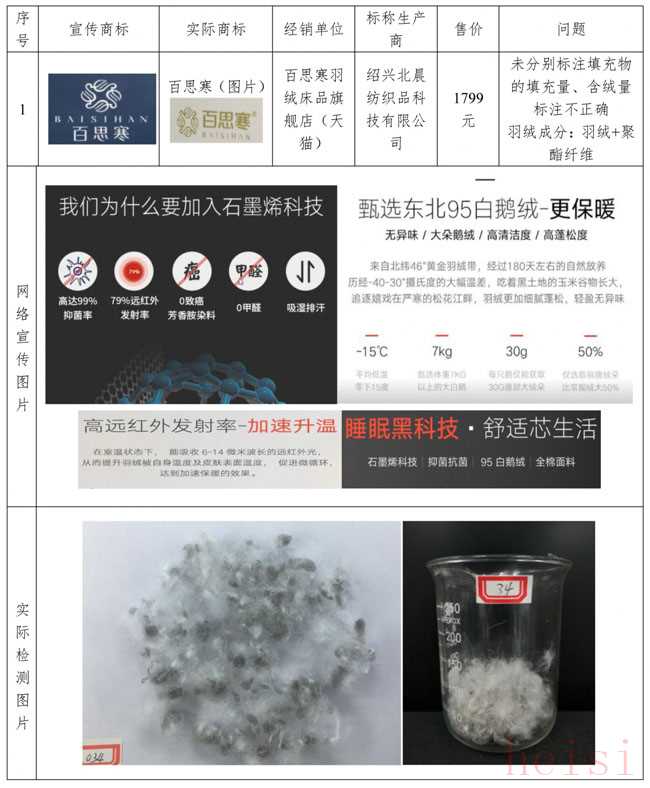 填充物质量方面,标称商标为“宝缦”、“富丽华”、“鸿润”、“温润东方”等5款样品填充物质量偏差率不符合相关标准要求;标称商标为“CP CLUB”的样品以鸭绒冒充鹅绒;标称商标为“喜连理”、“北迈”的2款样品用粉碎毛冒充羽绒作为填充物,且网页信息与实际样品不符,涉嫌坑害消费者;天猫商城销售的百思寒牌羽绒被样品明示成分为白鹅绒加入石墨烯纤维。经测试,其宣传的所谓石墨烯科技纤维实为聚酯纤维。