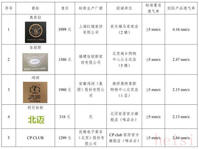透气性指标上,标称商标为“佳丽斯”、“鸿润”、“北迈”、“CP CLUB”等5种样品未达到相关标准要求。