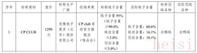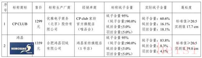 羽绒成分和蓬松度方面,标称商标为“CP CLUB”和“鸿昌”的2种样品羽绒成分测定和蓬松度未达到相关标准要求,涉嫌以次充好。