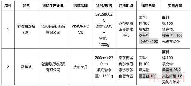 其中,标称商标为“VISIONHOME”和“皮尔卡丹”的2种样品纤维含量标注与实测值不符。
