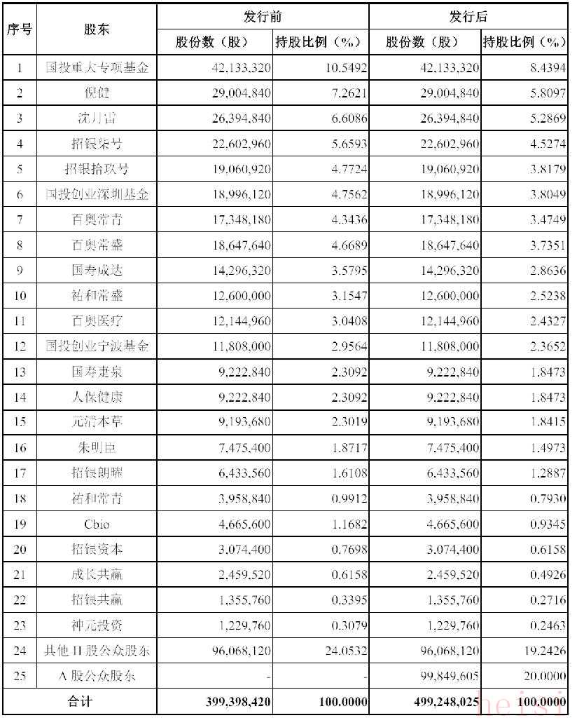 IPO前,国投重大专项基金持股为10.5492%,倪健持股为7.2621%,沈月雷持股为6.6086%,招银柒号持股为5.6593%,招银拾玖号持股为4.7724%,国投创业深圳基金持股为4.7562%,百奥常青持股为4.3436%,百奥常盛持股为4.6689%,国寿成达持股为3.5795%,祐和常盛持股为3.1547%,百奥医疗持股为3.0408%;