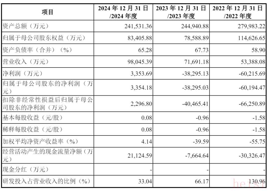 百奥赛图2022年、2023年、2024年营收分别为5.34亿元、7.17亿元、9.8亿元;净利分别为-6亿元、-3.83亿元、3354万元;扣非后净利分别为-6.63亿元、-4.05亿元、2297万元。