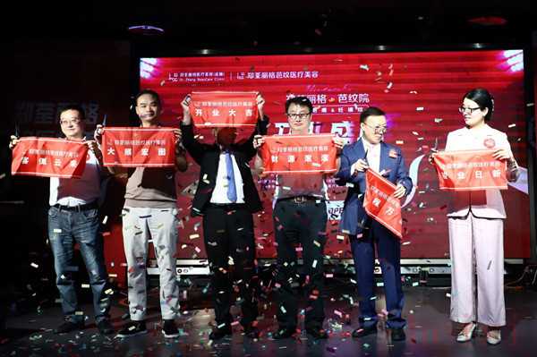 典礼现场,郑荃、于晓冬、文大江、郑荃丽格医疗美容涪陵院·总院长、青春院院长周业松、郑荃丽格医疗美容总院院长郭新娟、刘永涛共同剪彩,宣告郑荃丽格疤纹医疗美容开业,同时开启了专营特色医美专项的新篇章。