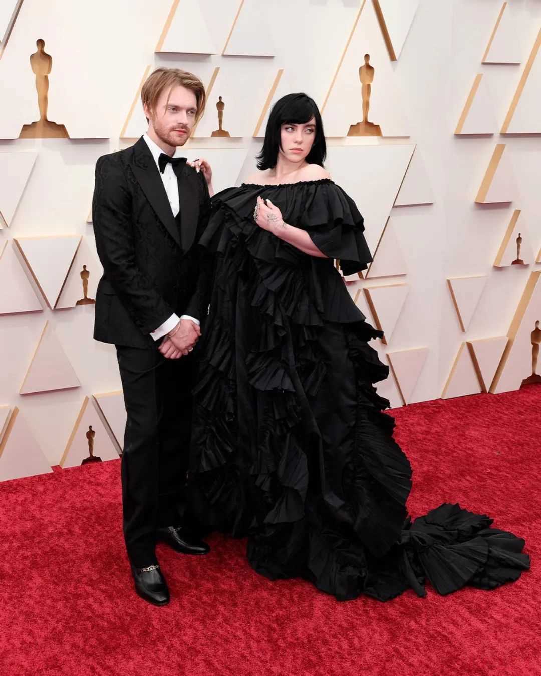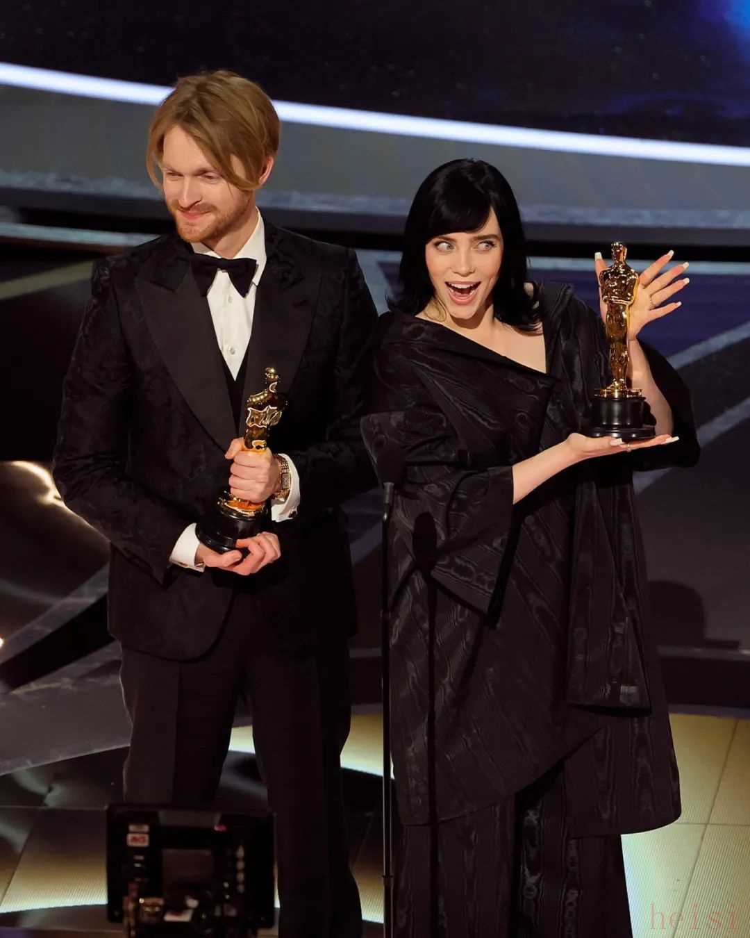 与此同时,斩获最佳原创电影歌曲奖的 Billie Eilish(比莉·艾利什),FINNEAS(菲尼亚斯)兄妹两人都穿着 GUCCI 的礼服登场和领奖。