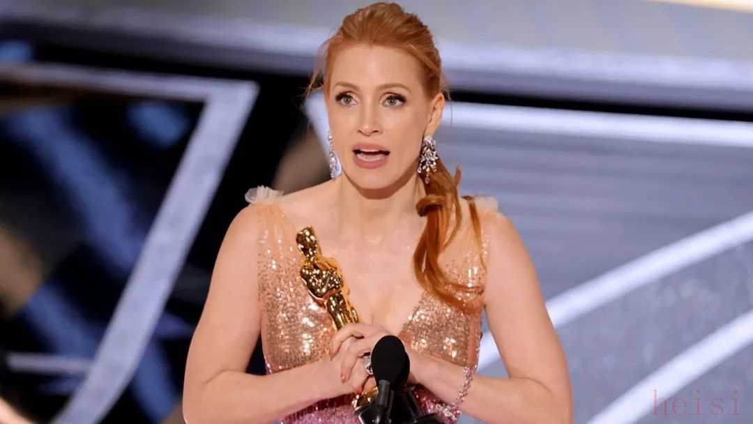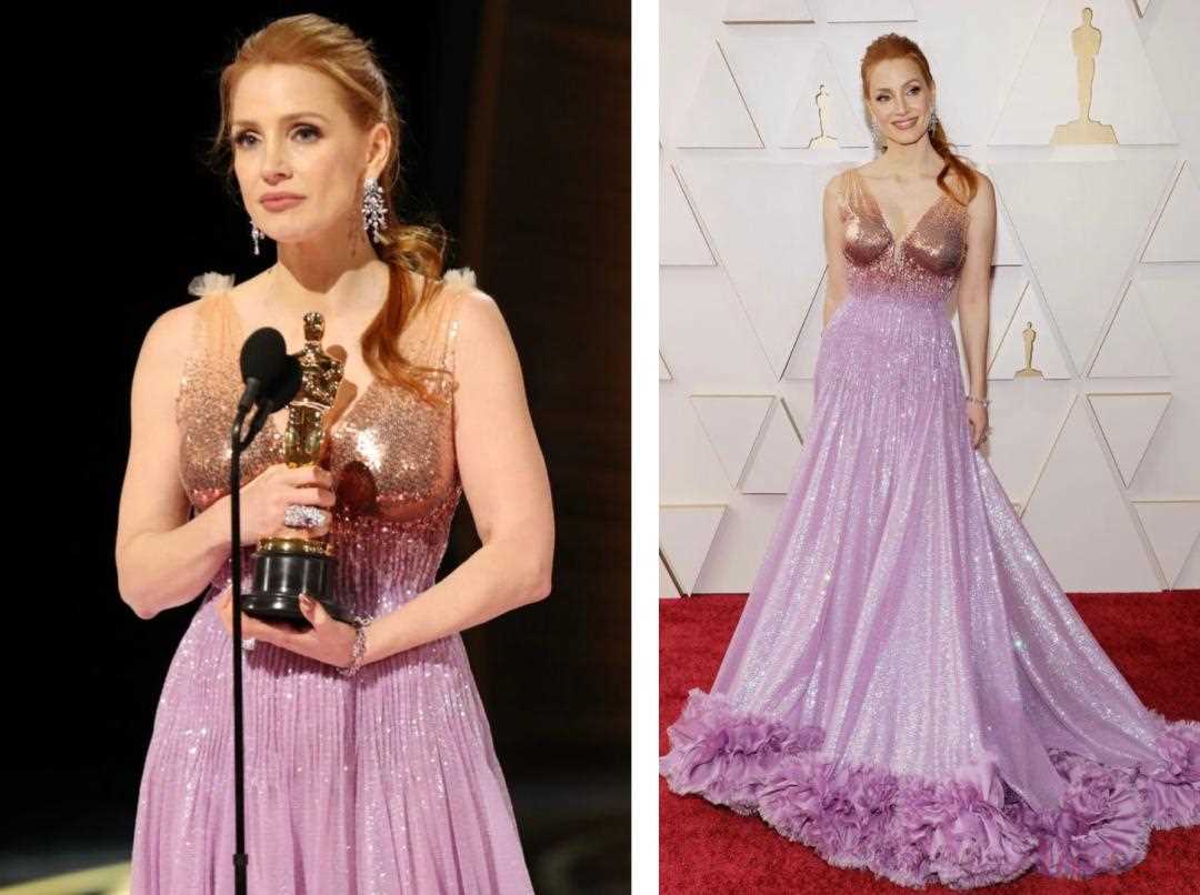 与此同时,Jessica Chastain 穿着量身订制的 GUCCI 礼服,非常浪漫又减龄的薰衣草浅紫色闪光亮片深V裙以梦幻醉人的姿态初登影后宝座的时刻,也被评为本届奥斯卡的时尚Moment,登上了不少杂志和新闻报纸的版面。