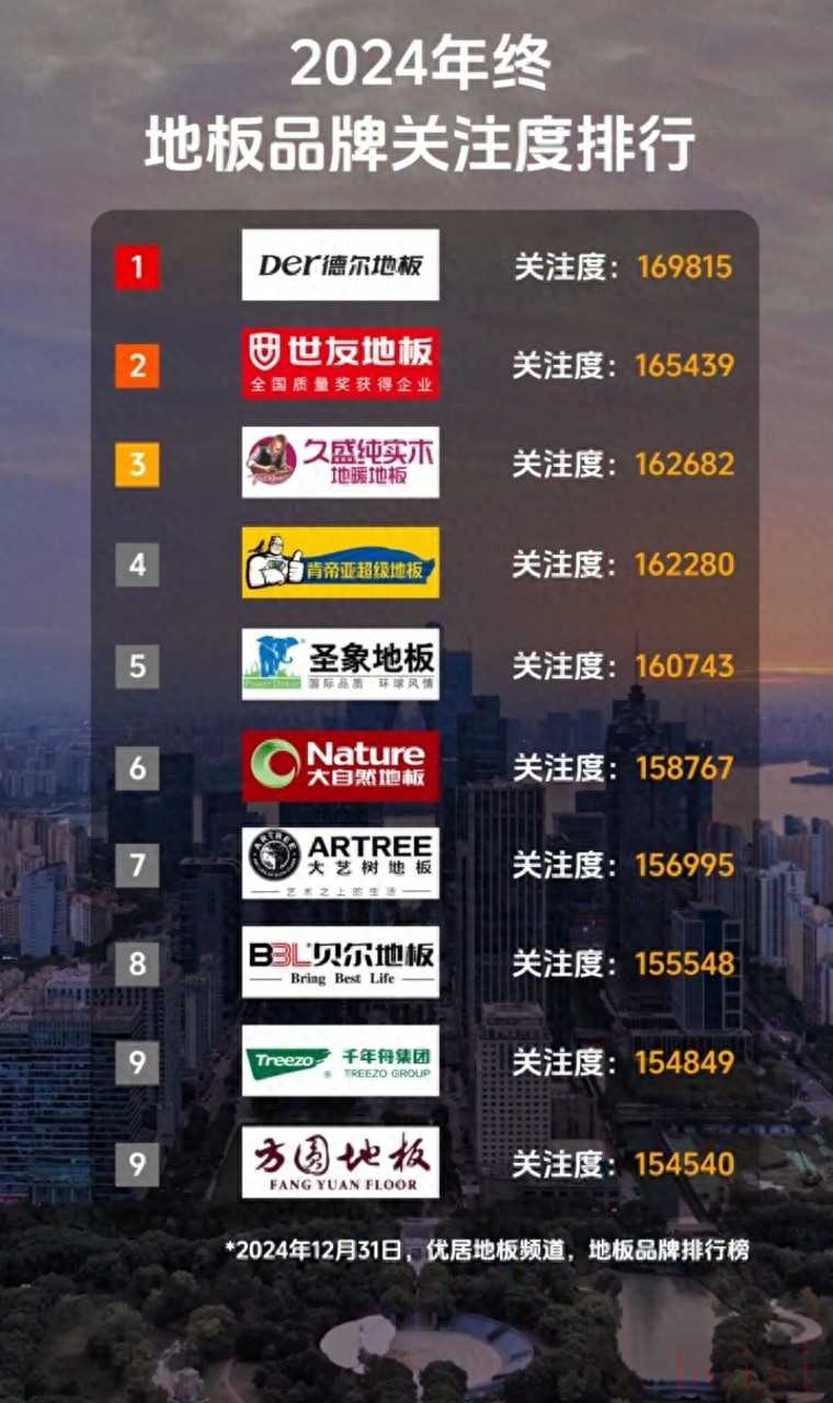 5. "德尔地板":德尔是中国地板行业的领军企业之一,以其先进的生产技术和环保材料而著称。品牌提供多种风格和功能的地板产品,满足不同消费者的需求。