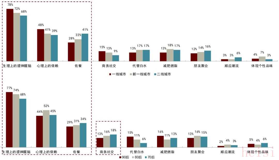 消费需求逐渐转向功能性刚需,消费频次高、需求稳定。对于中国消费市场来说咖啡属于舶来品,初期现磨咖啡主要以新潮时尚、“商务+娱乐”社交需求为主,且过去中国消费者缺乏日常咖啡饮用传统,因此呈现出受众范围局限、复购频次低的特点。在星巴克、瑞幸咖啡等国内外品牌的共同培育下,我国消费者(尤其高线城市年轻上班族)培育起一定的咖啡饮用习惯,以提神醒脑为核心的功能性需求逐渐迈向主流,消费频次逐渐提高,需求更加稳定。德勤数据显示,高线级城市以及70-90后饮用现磨咖啡主要原因的前两名分别为生理上的提神醒脑和心理上的依赖,占比分别超65%和40%,且生理上的提神醒脑需求在代际间呈上升趋势(从70后的68%上升至90后的77%);商务社交需求占比低于20%,在代际间呈下降趋势(从70后的18%下降至90后的13%),反映年轻一代对于咖啡饮用需求更偏功能性刚需。同时,刚需属性助力中高端咖啡龙头较客单价相近的现制茶饮龙头(如喜茶、奈雪的茶、星巴克客单价均超30元)有相对更高的门店渗透率(尤其是在一二线城市)。