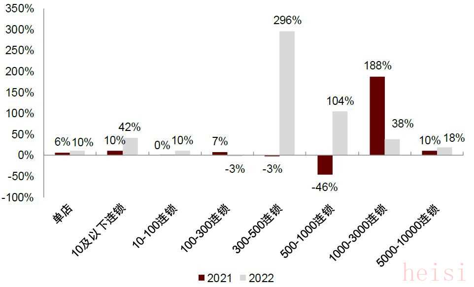 市场集中度提升空间广,疫后连锁化率显著提高。弗若斯特沙利文和窄门餐眼数据显示,2021年现磨咖啡CR5(按店数计)约13%,对比2020年高端现制茶饮CR5(按零售消费总额计)58%,市场集中度提升空间广。美团数据显示,2020-2022年咖啡连锁化率从24.4%提升至28.6%,对比饮品类整体以及茶饮店(2022年连锁化率分别为45.4%和55.3%)仍有一定提升空间。疫情冲击下单体店因经营困难出清,享有品牌溢价和规模效应的大型连锁咖啡品牌抗风险能力强,疫后连锁化率和市场集中度加速提升。美团数据显示,2021-2022年300家门店以上的大型咖啡连锁品牌门店数增速远超小型连锁咖啡品牌。