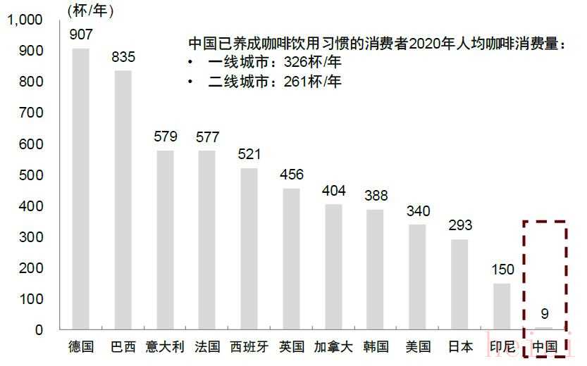 我国现磨咖啡市场快速发展,人均咖啡消费量提升空间广阔。艾瑞咨询数据显示,中国现磨咖啡市场规模2021年达到876亿元,对应2017-2021年CAGR 32.5%,预计2024年市场规模达1,917亿元,对应2021-2024年CAGR 29.8%。对比发达国家,2021年中国人均咖啡消费量仅9杯/年,远低于美国、日本等国家(如美国约为340杯/年、日本约为293杯/年);分线级城市来看,德勤数据显示,我国一线&二线城市的人均咖啡消费量(已养成咖啡饮用习惯的消费者)分别达326杯/年和261杯/年,而低线城市的人均咖啡消费量相比之下仍有广阔的提升空间。
