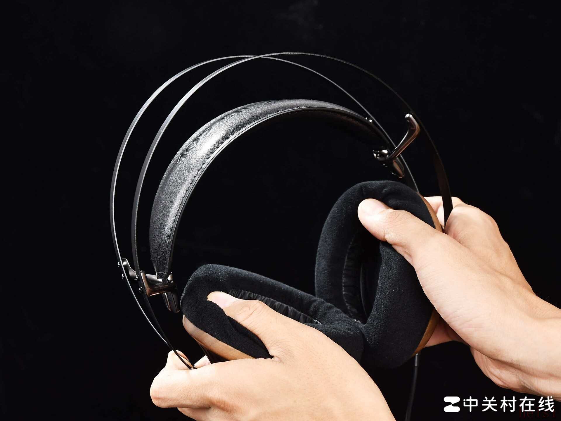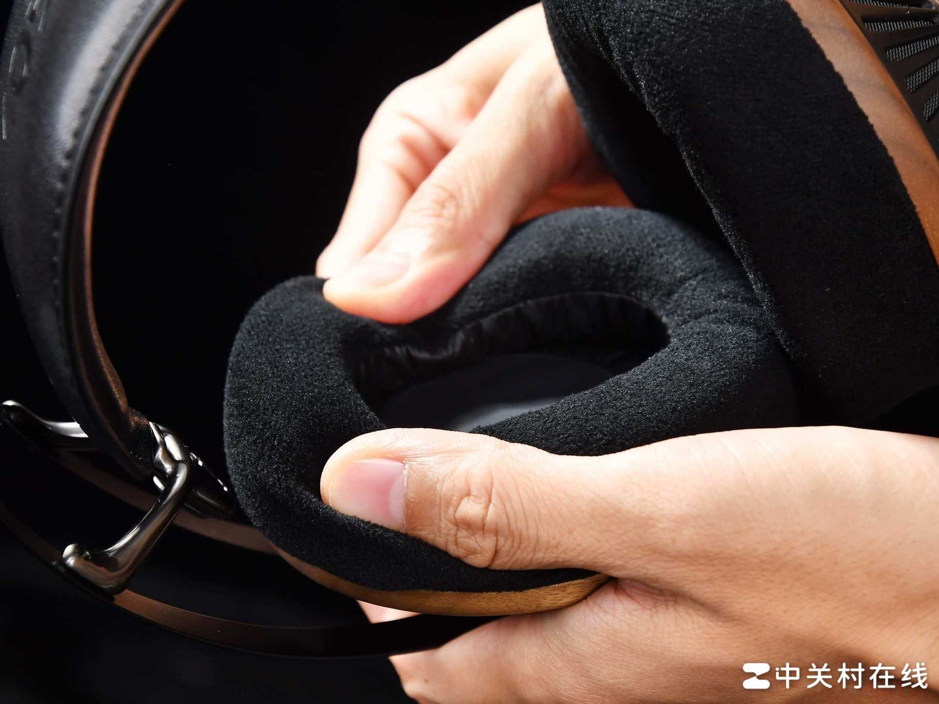 耳罩的贴合部分,Meze这次选用了厚实的天鹅绒耳垫。与常见的人造皮革耳垫相比,天鹅绒材质触感柔软亲肤,透气性更佳,适合长时间佩戴不易产生闷热汗湿感。我在非空调房环境连续听了几个小时,耳朵依然干爽舒适。耳垫内部填充海绵的软硬适中,既有足够支撑力又能温柔地“包裹”耳朵。
