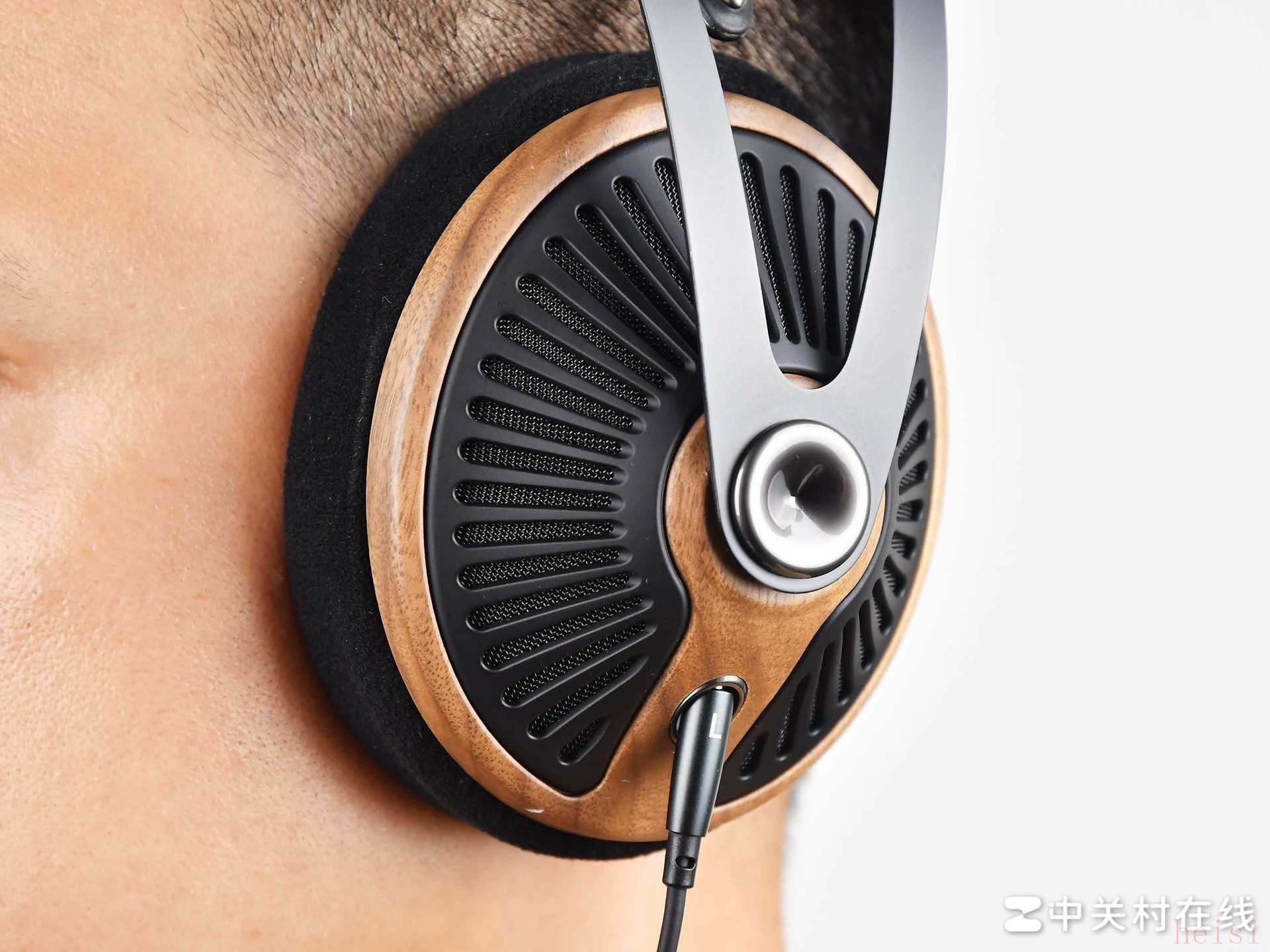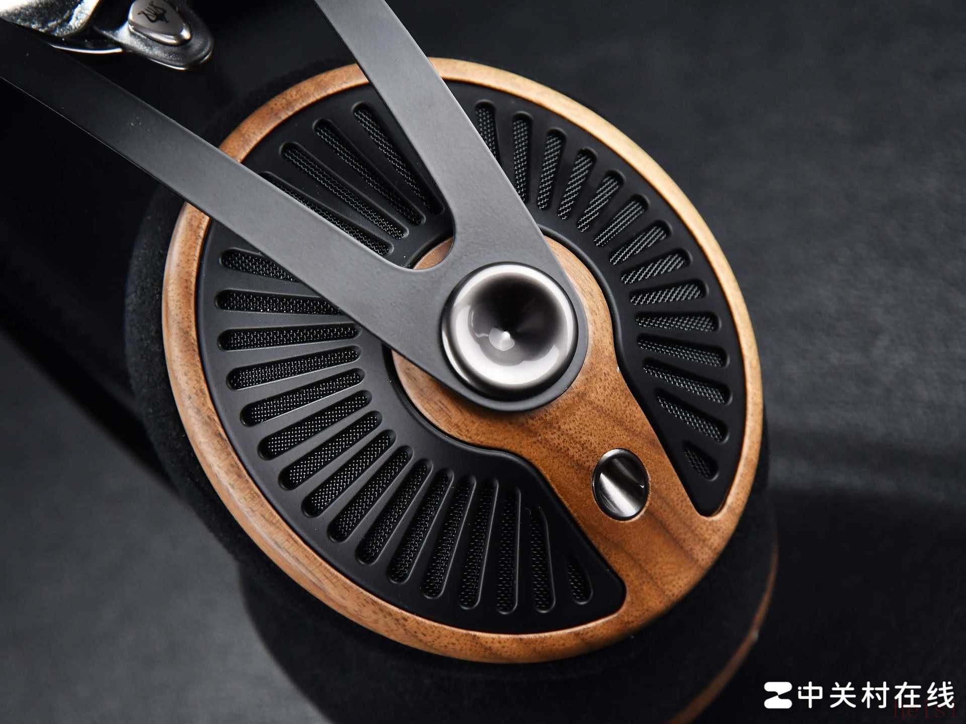 细节方面,我特别喜欢耳罩外侧那片放射状镂空网罩的设计,不仅视觉上很有辨识度,而且透过网罩还能隐约看到内部金色的驱动单元和导音结构,给人一种机械美学与自然材质融合的独特观感。总的来说,Meze 105 SILVA在外观与佩戴方面几乎挑不出什么毛病:既有赏心悦目的艺术气质,又具备出色的人体工学,对得起发烧友对旗舰级做工的苛刻要求。