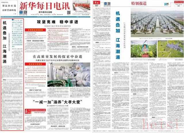 2月27日,新华社《新华每日电讯》头版并8版整版刊发重点报道《机遇叠加 江海潮涌——江苏推动高质量发展走在前列》,讲述江苏贯彻习近平总书记提出的“强富美高”新江苏、“五个迈上新台阶”要求,推动高质量发展走在前列的生动实践。