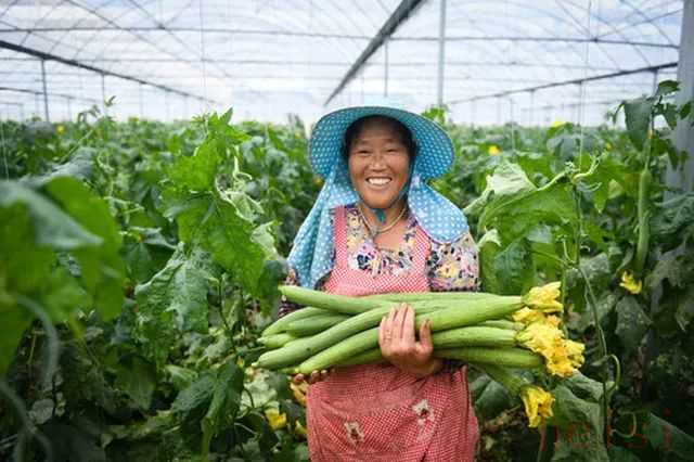 在江苏省响水县九丰现代高效农业示范园的大棚内,56岁的农民徐晓菊展示收获的丝瓜(2018年9月21日摄)。新华社记者季春鹏摄