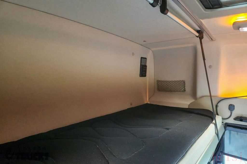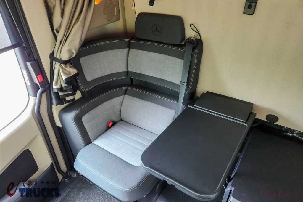 并且,SoloStar“孤星”单人生活舱套件也出现在了这台eActros 600纯电动重卡之上。这个套件将固定式的下卧铺改成了折叠式,并收纳于驾驶室后壁之上。利用床下和床底空间,奔驰设计了一套环形沙发,并配备折叠式桌板,供驾驶员日常休息使用。
