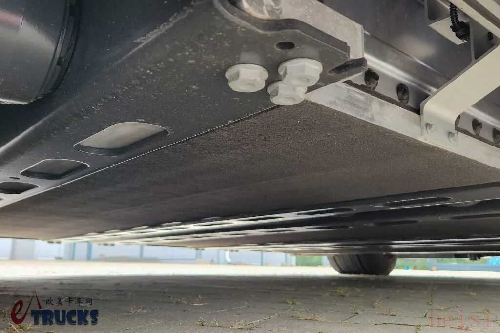 传统的中央电驱动系统如同柴油卡车一般,需要安装中央电机、变速箱、传动轴等部件,使底盘空间利用率较低。采用电驱桥的奔驰eActros 600没有这种顾虑,因此其电池采用了横贯底盘的形式安放,最大程度利用空间,以此实现更短轴距、更高机动性。电池底面设计有防护结构及防护涂层,减少因托底等事故对电池带来的伤害。