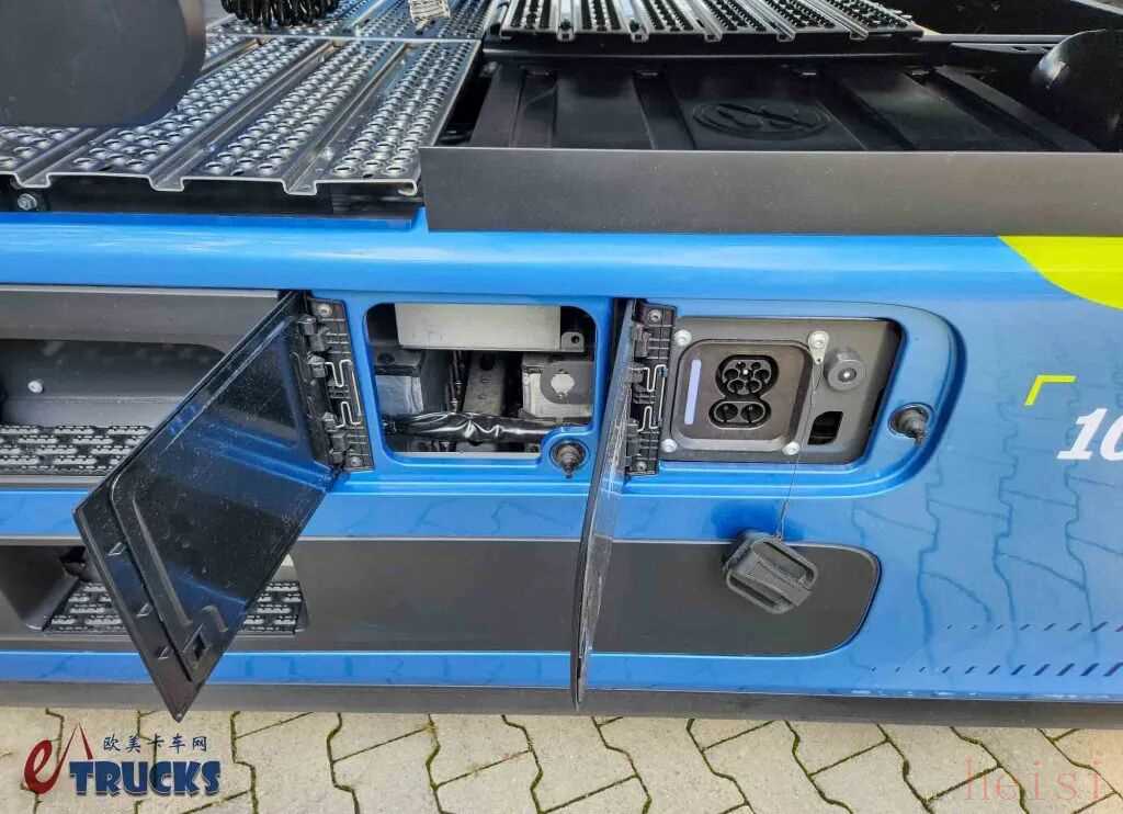 奔驰eActros 600基于800V高压平台打造而来,有着极高的能源效率,进而促成了整车的长续航。目前,奔驰eActros 600提供400千瓦功率的CCS直流快充,未来提供1兆瓦功率的超级直流快充。即使不采用MCS兆瓦快充,奔驰eActros 600也能实现日行千里的目标。充电口前方是车辆的断电线。当车辆出现事故时,切断这根线便能断开整车高压电路,保证救援人员安全性。在驾驶室等地,也能找到这根线。