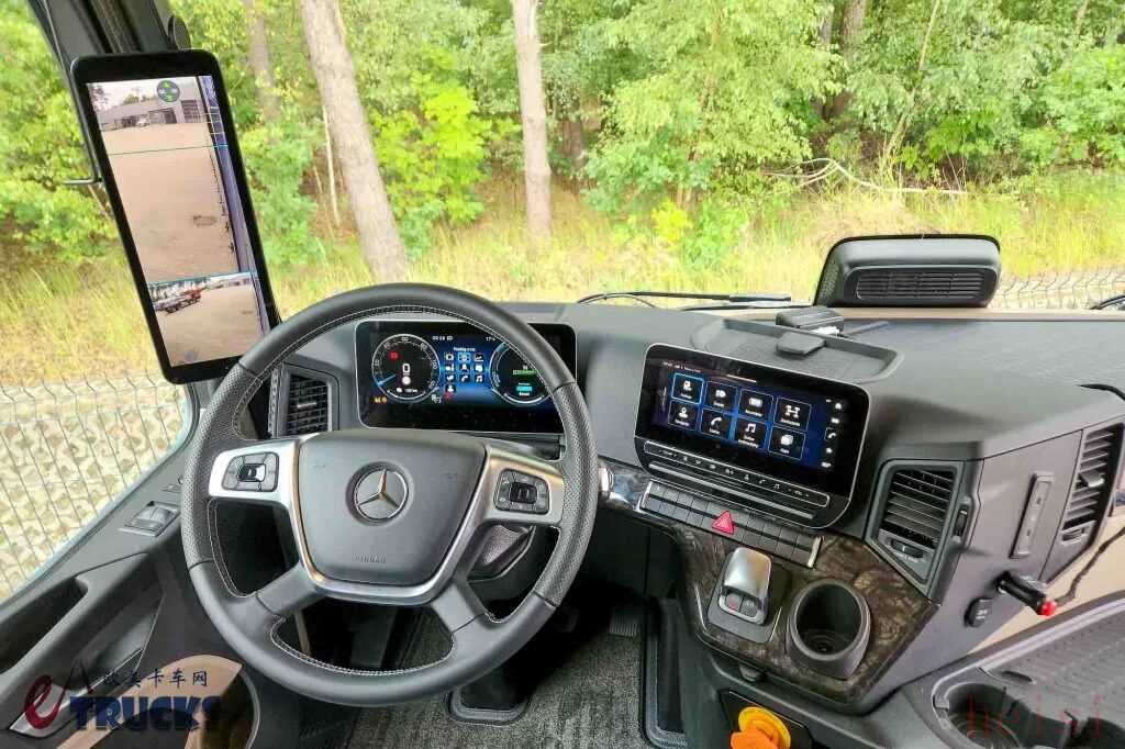 接下来是内饰部分。同第二代Actros L旗舰柴油重卡一样,奔驰eActros 600也用上了第二代多媒体座舱系统。它延续了奔驰一贯以来的科技感和豪华感,无论是全液晶仪表盘、电子后视镜屏幕,还是四幅式方向盘的设计,都非常的具有奔驰特色。本车还采用了TrendLine内饰包,木纹饰板与科技感内饰相结合,塑造更强的氛围感。