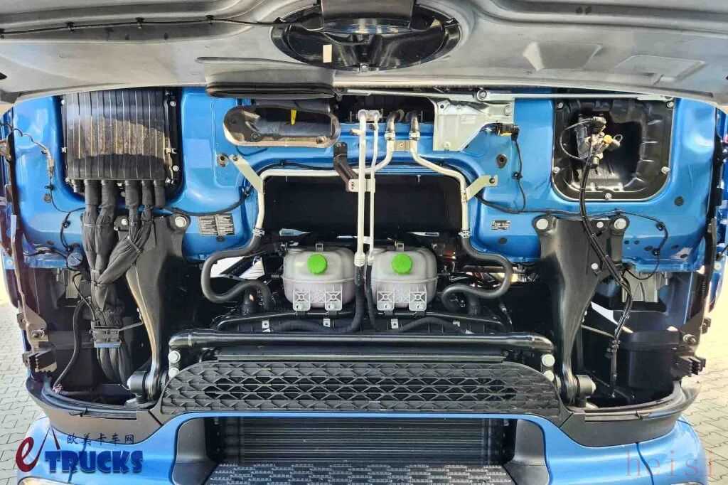 掀起前面罩,你会发现一个有趣的事实:奔驰eActros 600的驾驶室下方仍然有一条上凸的通道,专为柴油发动机而预留。原因在于:奔驰eActros 600纯电动重卡与第二代Actros L柴油重卡共享车型平台,为了保证通用性,奔驰的工程师便采用了如此独特的设计。为了利用这块空间,奔驰工程师开发了“Front Box” 集成式附件系统,集成了高压-低压转换器、空气压缩机、电控单元等零部件,进而将底盘侧面的空间让给电池,提升整车空间利用率。