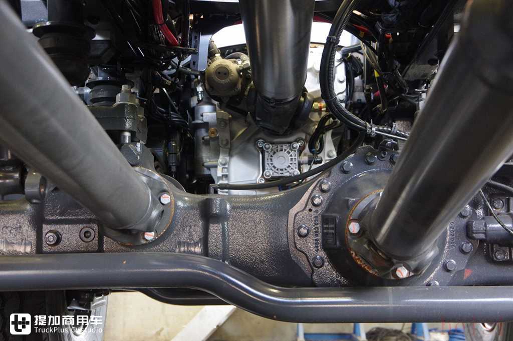 位于车辆中央的附加第三轴占据了绝大部分的位置,油箱必须使用异形油箱,同时储气罐安置位置也进行了更改。第三轴虽然不能转向,但可以提升,减少轮胎磨损,增强机动性表现。