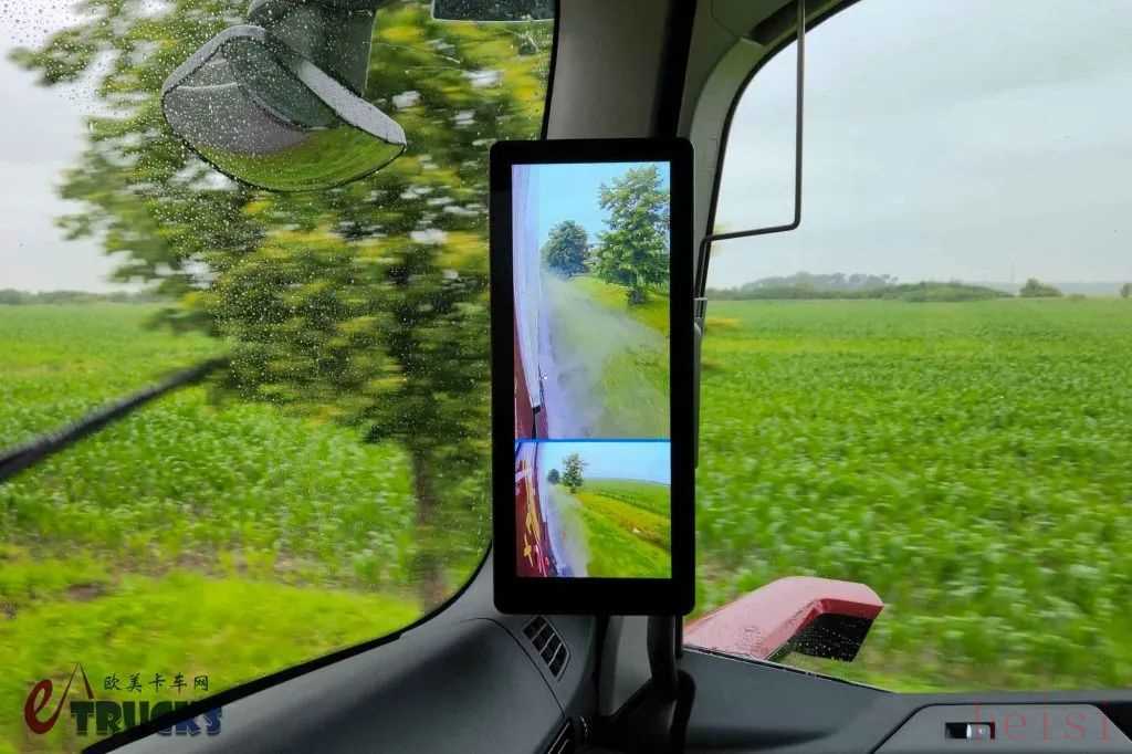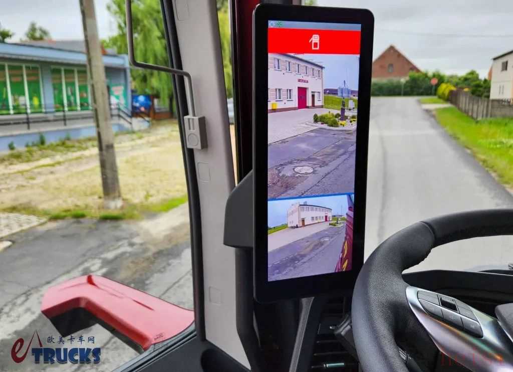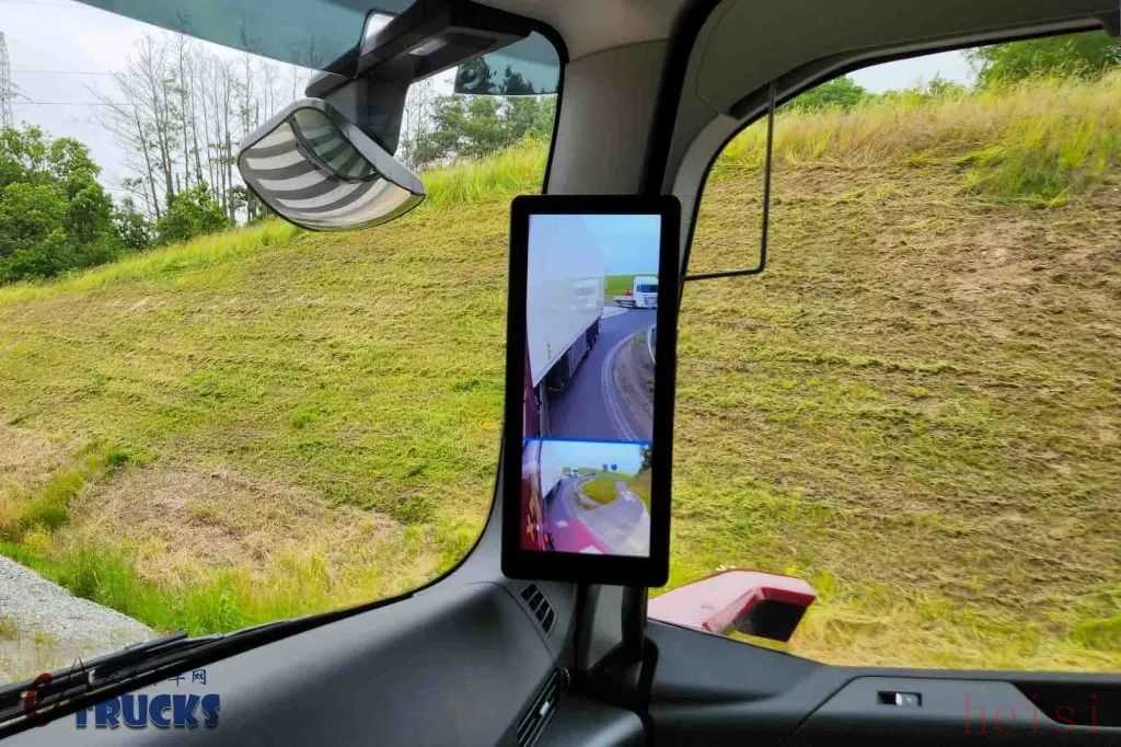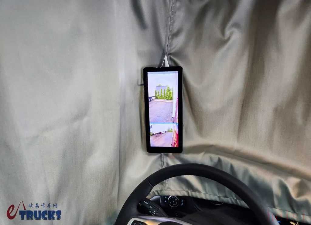 同其他欧卡主流解决方案一样,第二代福特F-MAX也将电子后视镜的显示屏幕放在了左右A柱之上。画面分为上下两部分,其中上方为车尾长焦视角,下方为车身广角视角,二者合作覆盖车身侧面区域。像车尾标线、挂车尾部跟踪等功能也是有的,使用体验这一块并不会落后于一线大厂。