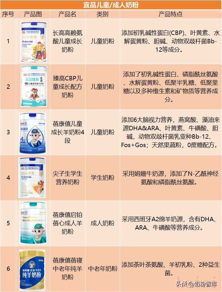 宜品覆盖儿童发育、成人健康管理等多元场景,产品以羊奶为基础,聚焦细分功能需求。旗下的“蓓康僖”儿童羊奶粉主打6大脑视力营养成分,学生奶粉“尖子生”特别添加N-乙酰神经氨酸;中老年系列涵盖益生菌羊奶粉及茶叶茶氨酸配方,更好满足特定人群需求。