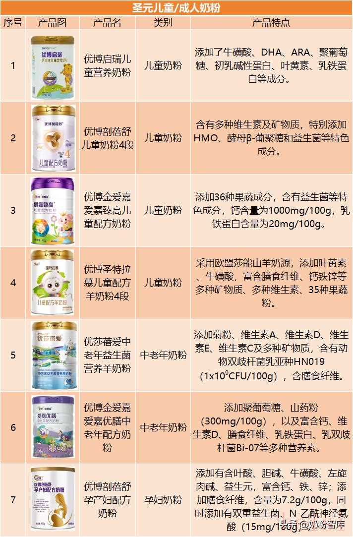 圣元在儿童粉、成人粉领域的产品布局以优博系列为主,覆盖儿童、中老年及孕产妇等人群。如儿童奶粉有“优博剖蓓舒”、“优博金爱嘉”、“优博圣特拉慕”等多款产品可供选择。其中优博剖蓓舒特别添加HMO、酵母β-葡聚糖和益生菌等成分;优博金爱嘉则以36种果蔬成分为特色;优博圣特拉慕奶源采用欧盟莎能山羊奶源。中老年粉和孕妇奶粉的配方也很全面,能满足不同年龄段精准需求。