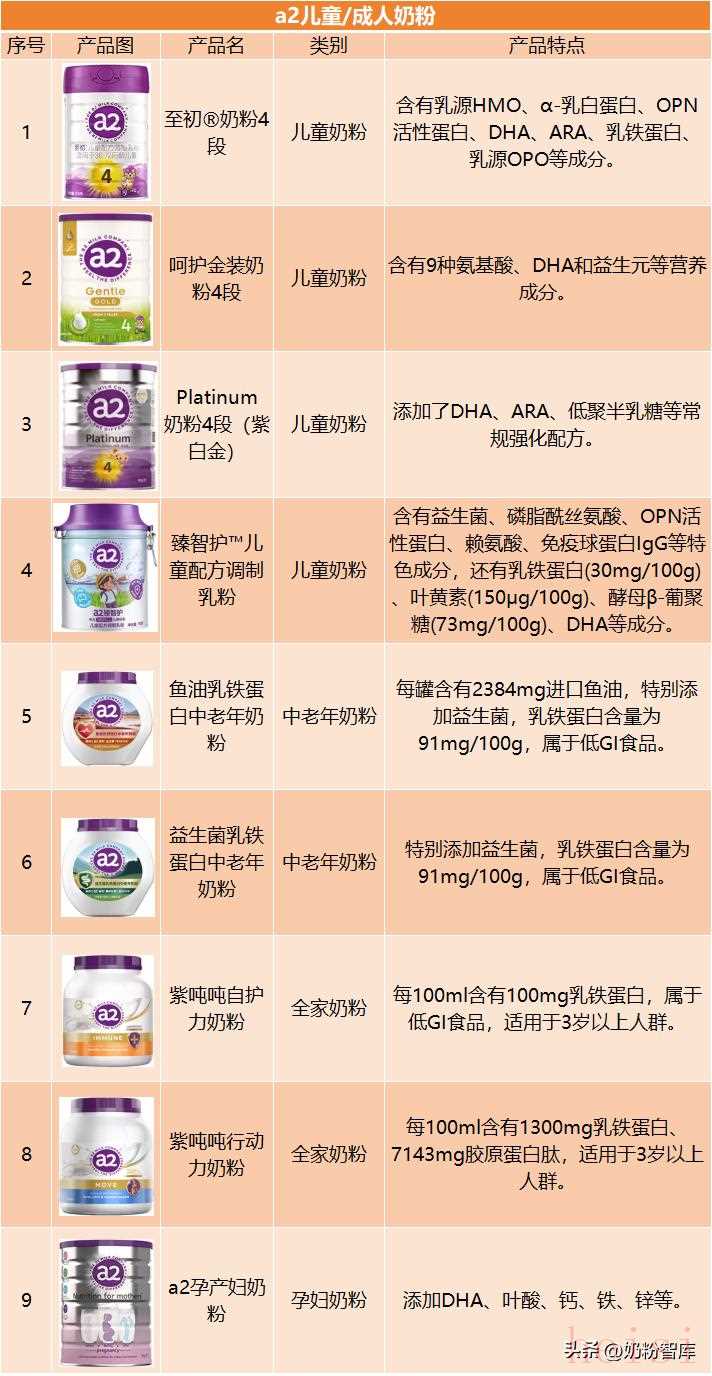a2的儿童粉、中老年粉、孕妇奶粉、全家奶粉等多个细分品类紧密围绕其“A2型蛋白质”核心特色。儿童奶粉“臻智护”系列添加益生菌、磷脂酰丝氨酸、OPN活性蛋白、免疫球蛋白IgG等特色成分,还有高含量的乳铁蛋白、叶黄素、酵母β-葡聚糖、DHA等多种助力孩子成长的营养;中老年奶粉注重鱼油、益生菌等营养成分与乳铁蛋白的搭配,且大多属于低GI食品,同时有“紫吨吨”系列全家奶粉及孕产妇奶粉等来满足全家营养需求。