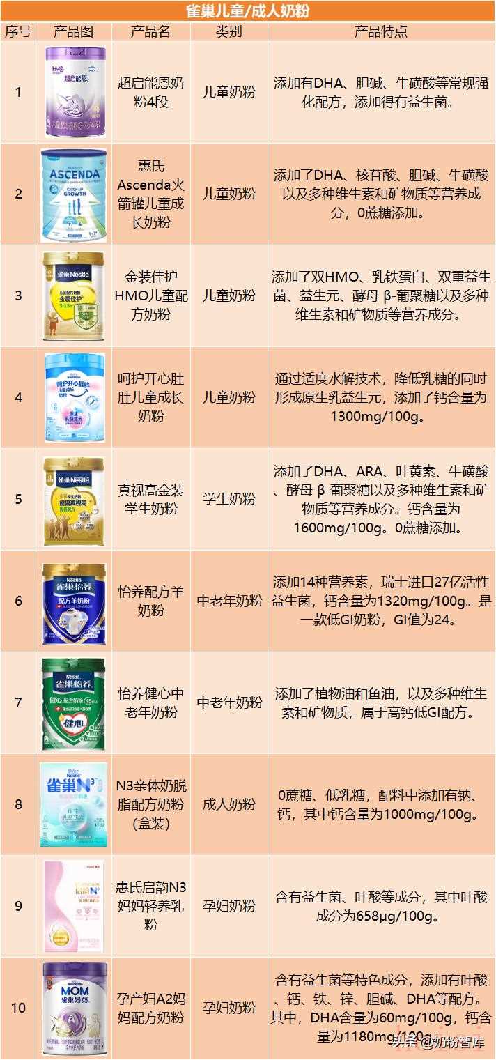 雀巢在儿童粉、成人粉领域的产品布局充分体现其科研实力。雀巢儿童奶粉有“超启能恩”、“惠氏Ascenda”、“金装佳护”等系列,另外还有呵护开心肚肚儿童奶粉,这款奶粉通过适度水解技术,在降低乳糖的同时形成原生乳益生元;中老年奶粉“怡养”系列涵盖高钙、健心等针对性配方,同样属于低GI奶粉;针对孕妇也有多款奶粉可以选择,如惠氏启韵、雀巢妈妈等。