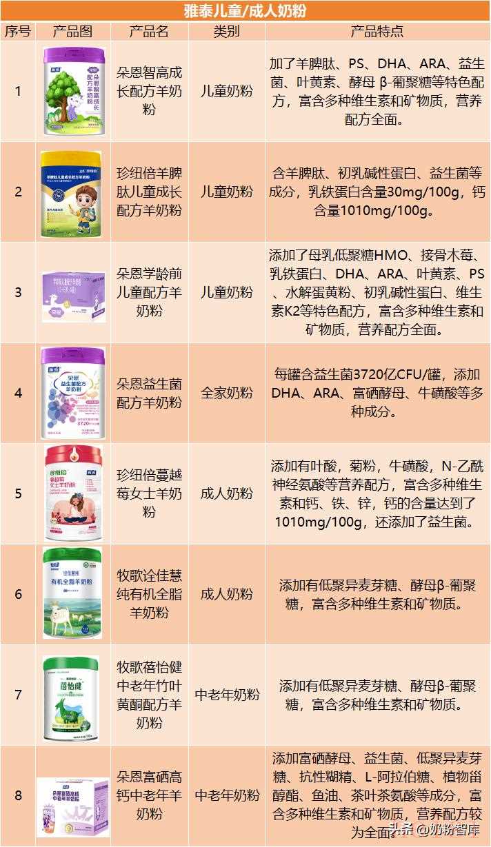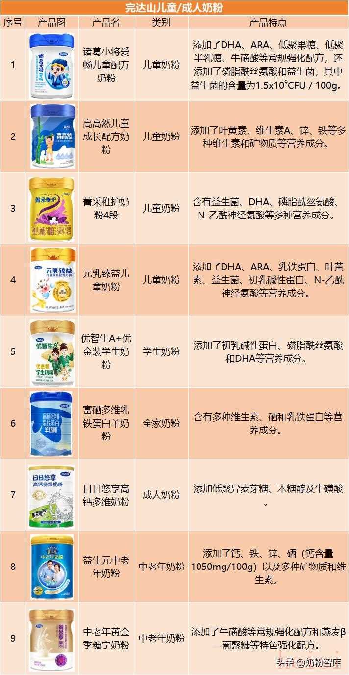 完达山作为老牌乳企,产品注重基础营养强化。儿童粉如“诸葛小将”等系列添加磷脂酰丝氨酸、益生菌等营养成分,另外还有“高高然”、“菁采稚护”、“元乳臻益”等多款儿童奶粉;成人粉包括“富硒多维乳铁蛋白羊奶粉”等全家奶粉、“黄金季糖宁奶粉”等中老年奶粉。
