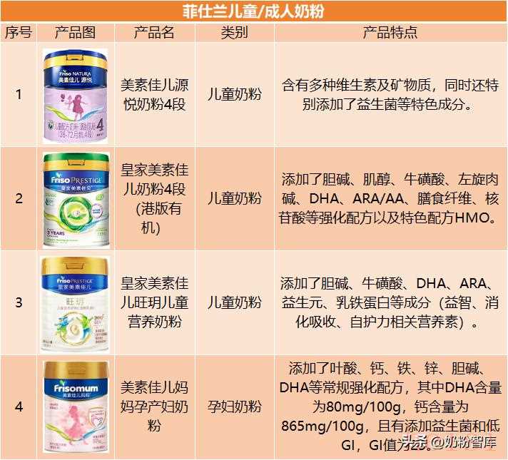 菲仕兰的产品布局以美素佳儿为核心,儿童奶粉包括“源悦”、“皇家”等系列,其中美素佳儿源悦含有多种维生素及矿物质,同时还特别添加了益生菌等特色成分;美素佳儿妈妈孕产妇奶粉强化了叶酸、钙、铁及DHA等配方,并采用低GI配方。