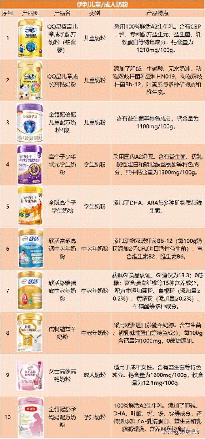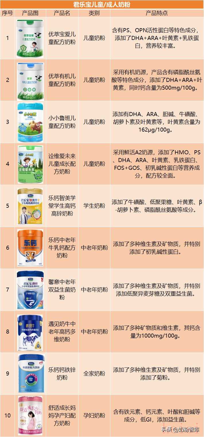 粉哥导读奶中富含优质的蛋白质、钙等营养成分,随着大家健康意识的提高,越来越多人养成了喝奶的习惯。很多大家熟悉的品牌,如伊利、蒙牛、达能、a2、飞鹤、君乐宝等,除了婴配粉,也都相继推出了儿童奶粉、孕妇奶粉、中老年奶粉等,能够满足全家人的营养需求。那有哪些产品可供大家选择呢?今天粉哥盘点了20多家品牌旗下的产品,一起来看看~1.伊利