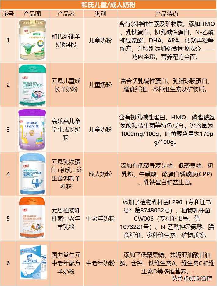 和氏在儿童粉、成人粉领域的产品布局多元,儿童奶粉如“莎能”系列注重HMO、乳铁蛋白等特色成分;成人粉包括高钙、益生菌配方的中老年奶粉,以及适用于一般成人的“元恩乳铁蛋白+初乳+益生菌调制羊乳粉”,覆盖全年龄段的营养需求。